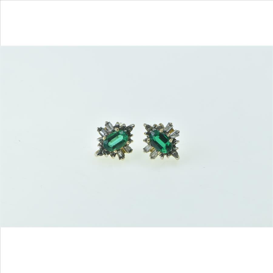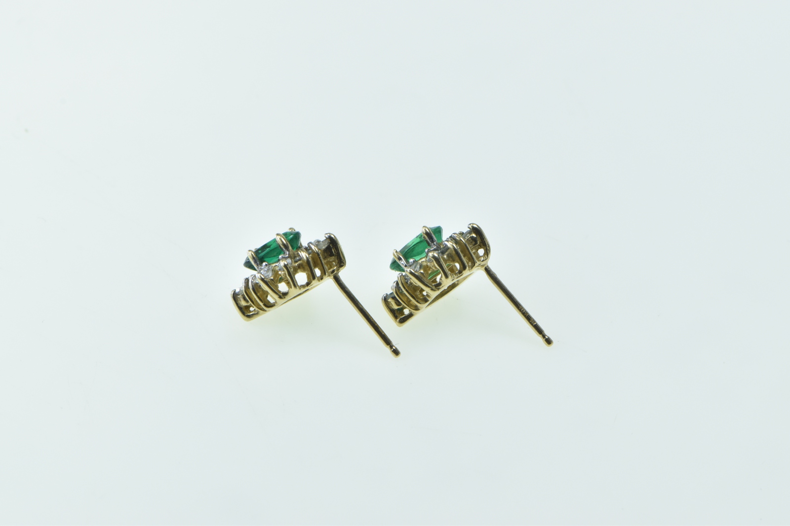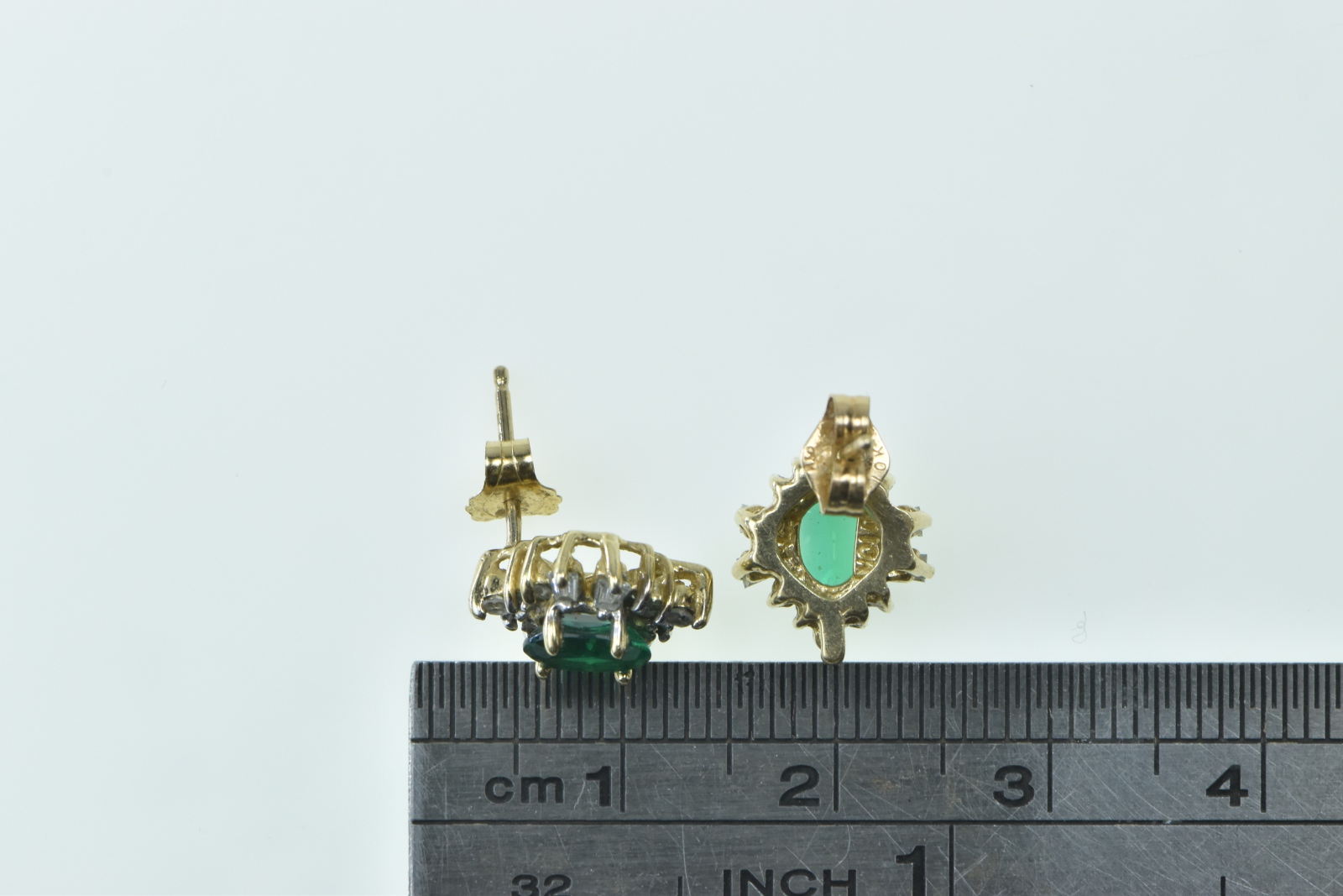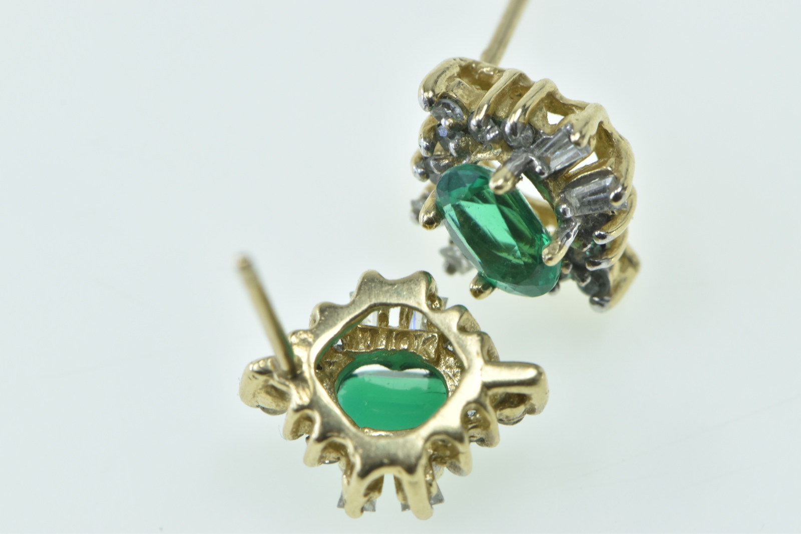 10K Oval Syn. Emerald Diamond Halo Statement Stud Yellow Gold Earrings