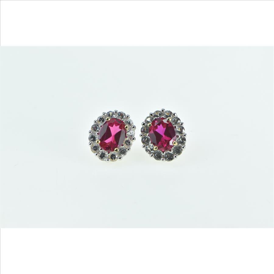 Item:  10K Oval Syn. Ruby White Sapphire Halo Vintage Stud Yellow Gold Earrings