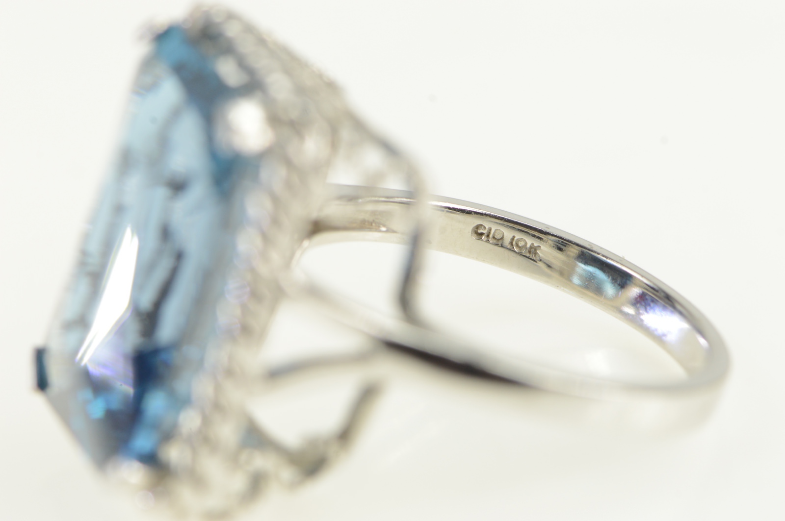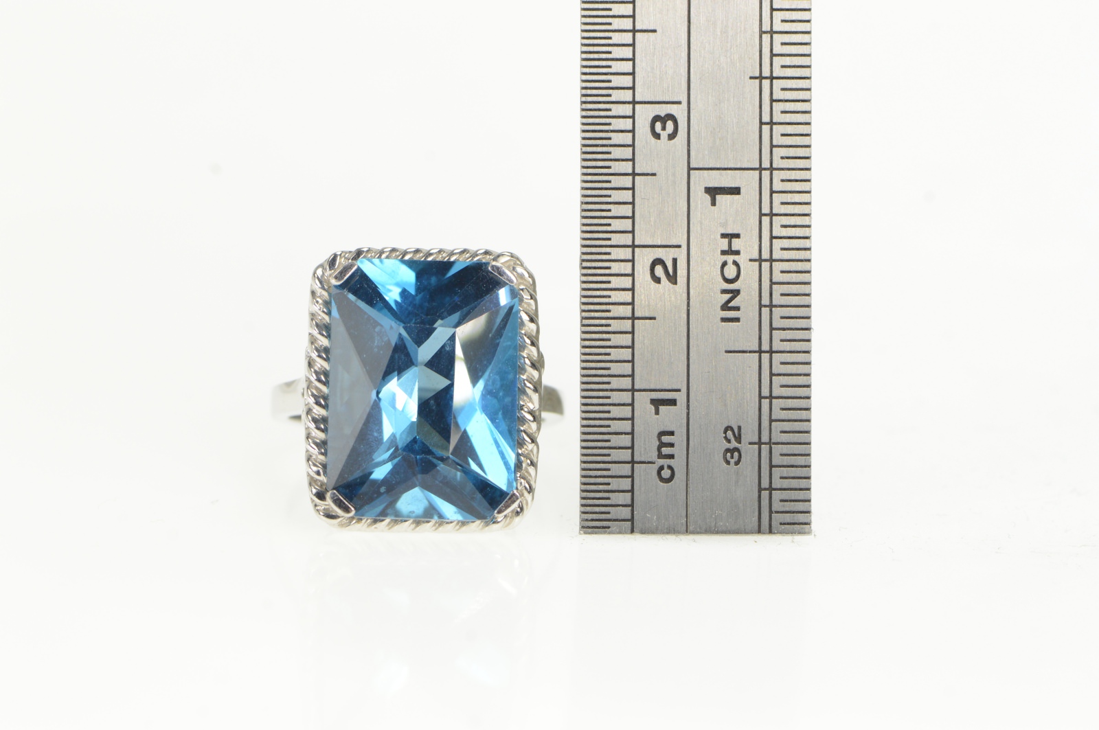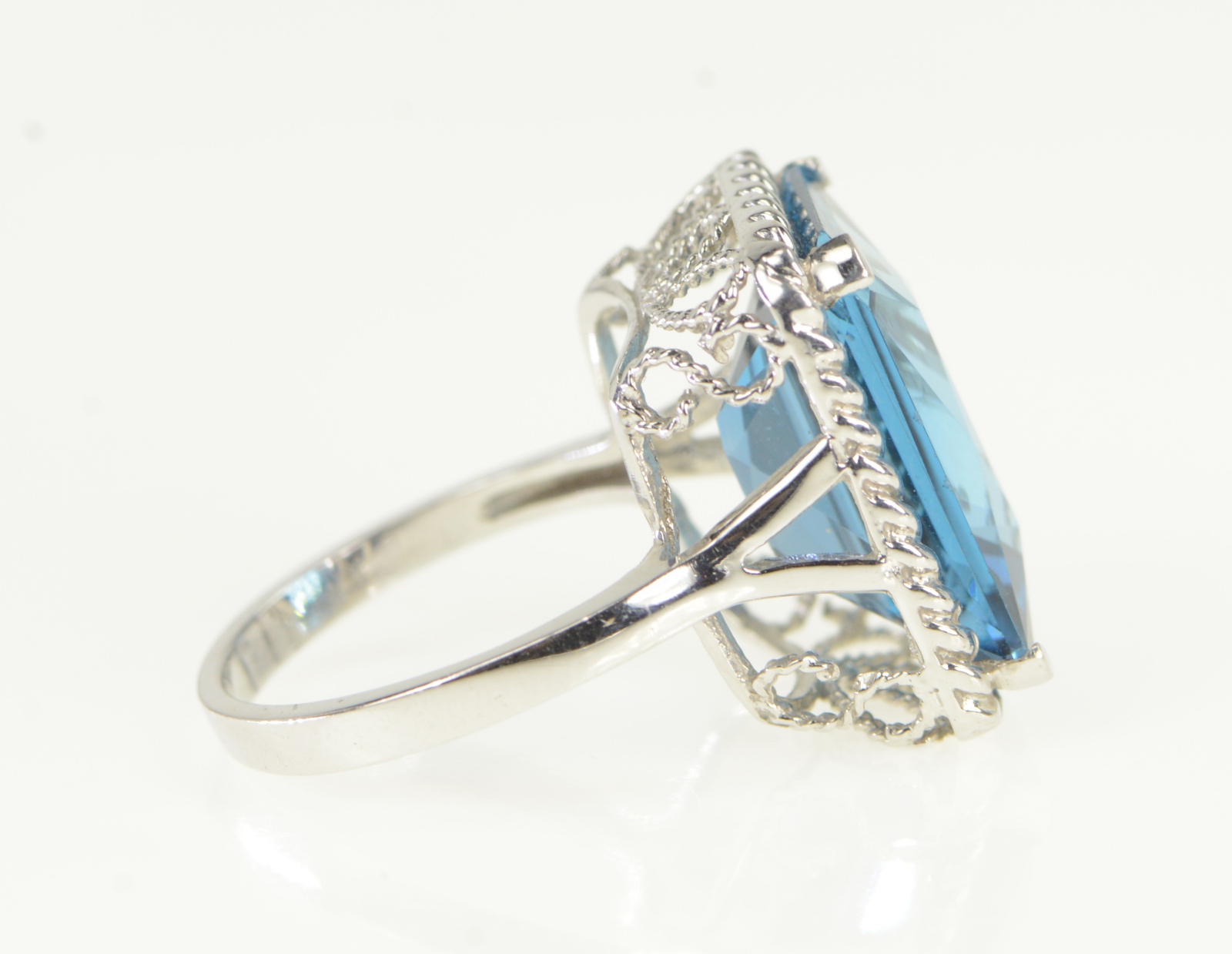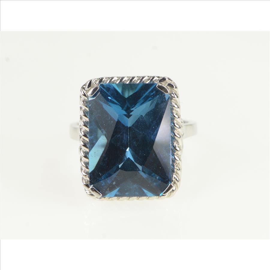 Item:  10K Radiant Cut Blue Topaz Ornate Cocktail White Gold Ring, Size 8