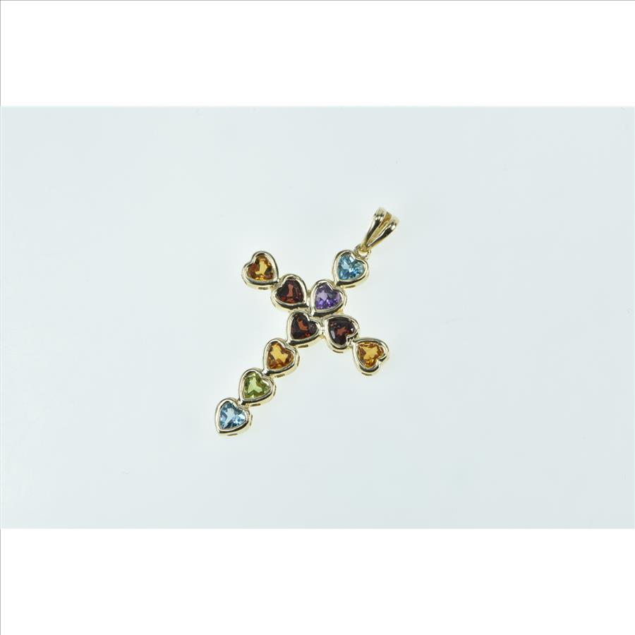 Item:  10K Rainbow Heart Gemstone Cross Christian Yellow Gold Pendant