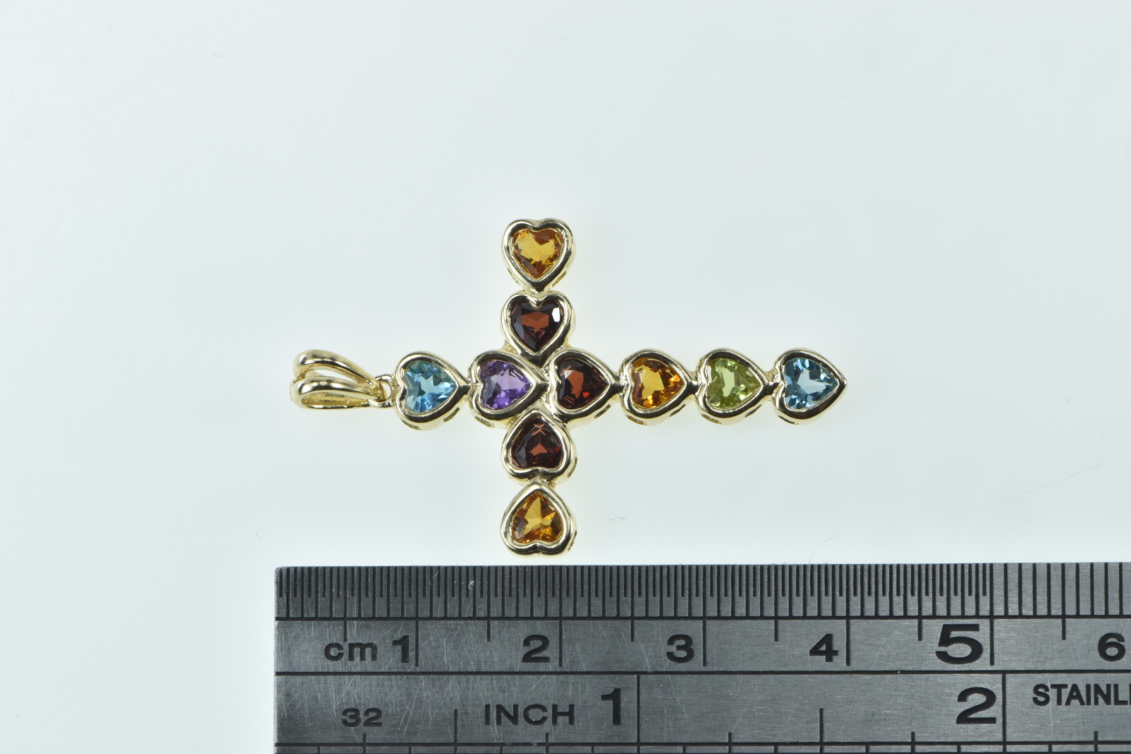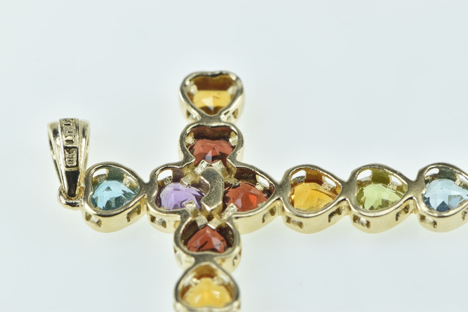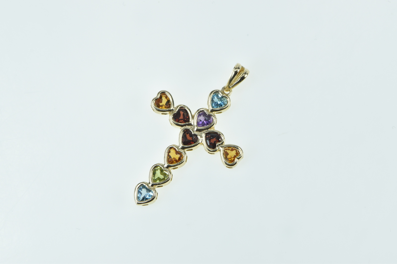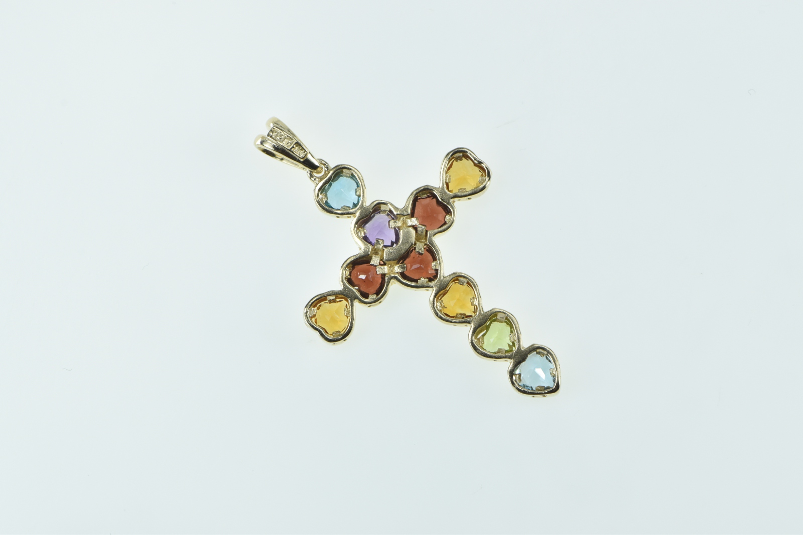 10K Rainbow Heart Gemstone Cross Christian Yellow Gold Pendant