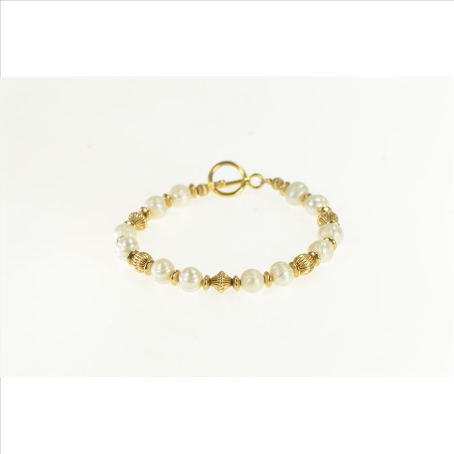 Item:  10K Retro Vintage Pearl Ornate Toggle Clasp Yellow Gold Bracelet 6.5"