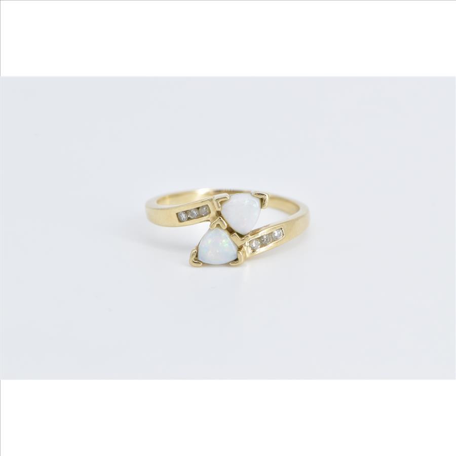 Item:  10K Trillion Syn. Opal Diamond Vintage Bypass Yellow Gold Ring, Size 7.75