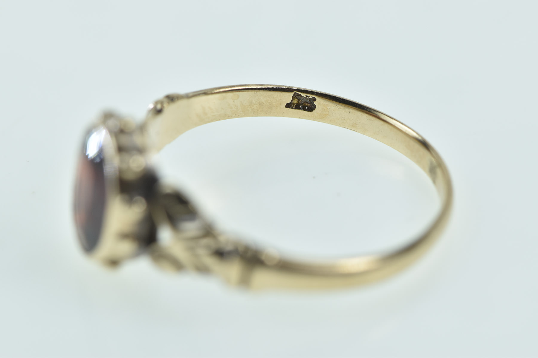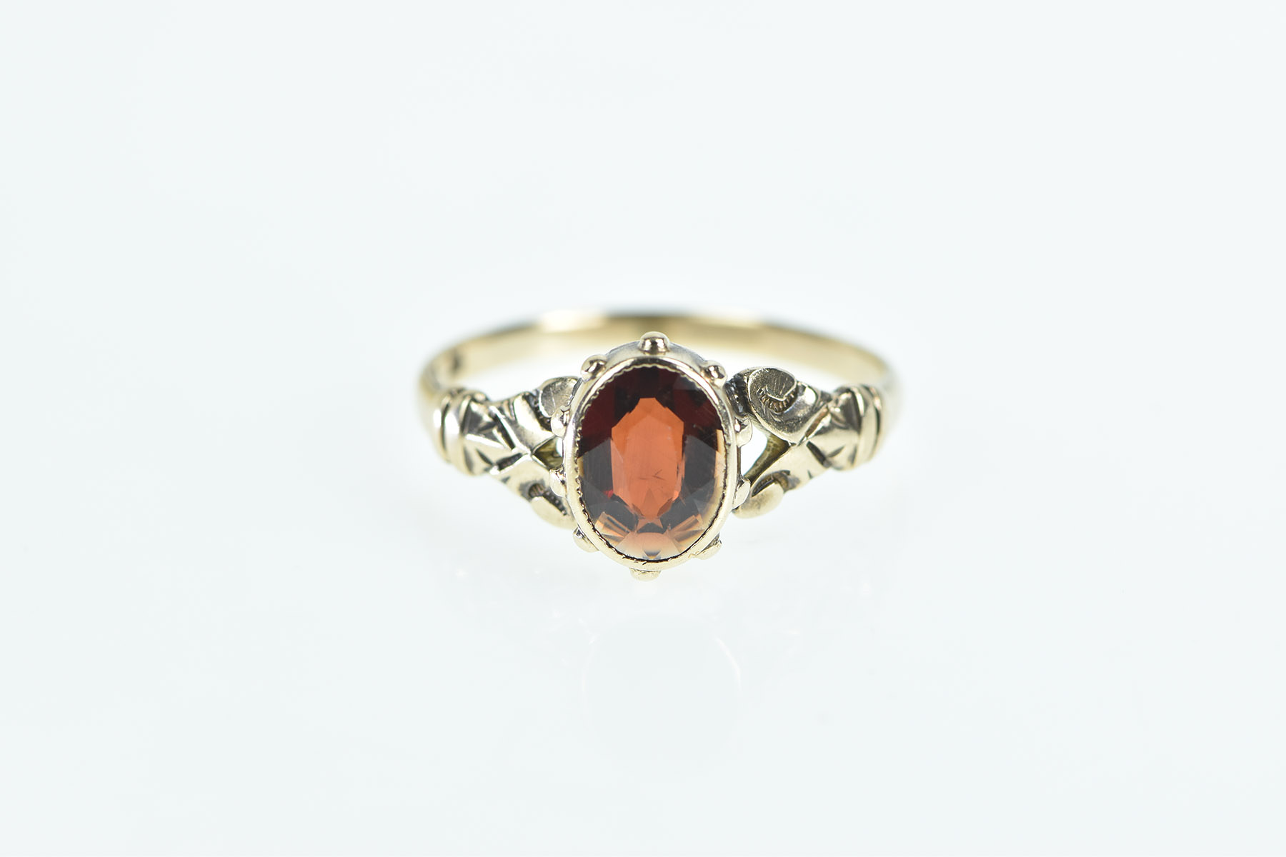 Item:  10K Victorian Garnet Ornate Scroll Statement Yellow Gold Ring, Size 8.5