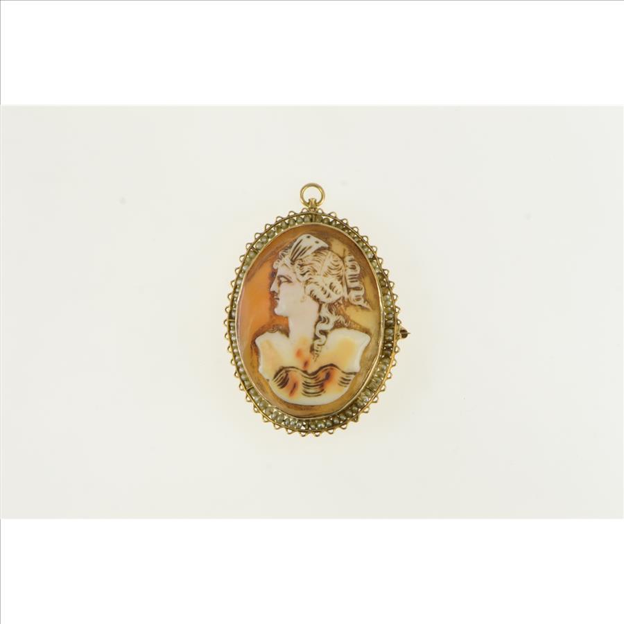 Item:  10K Vintage Coral Cameo Seed Pearl Yellow Gold Pendant/Pin