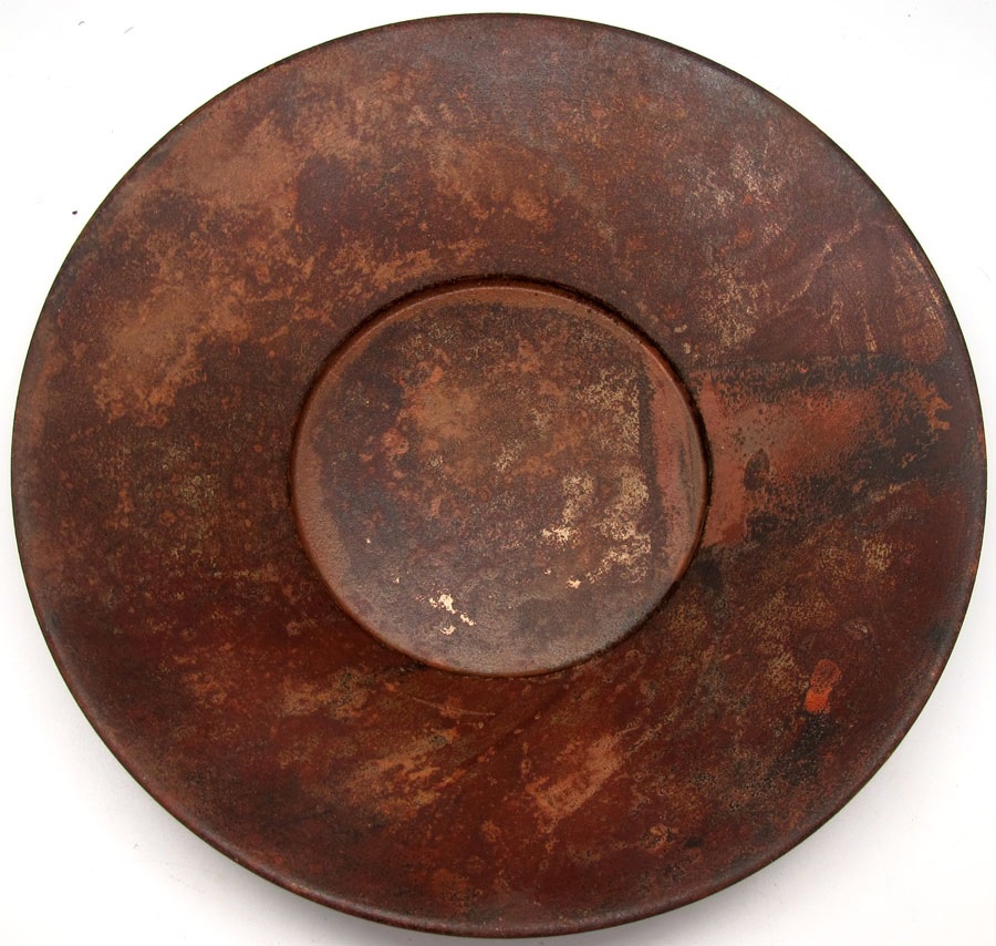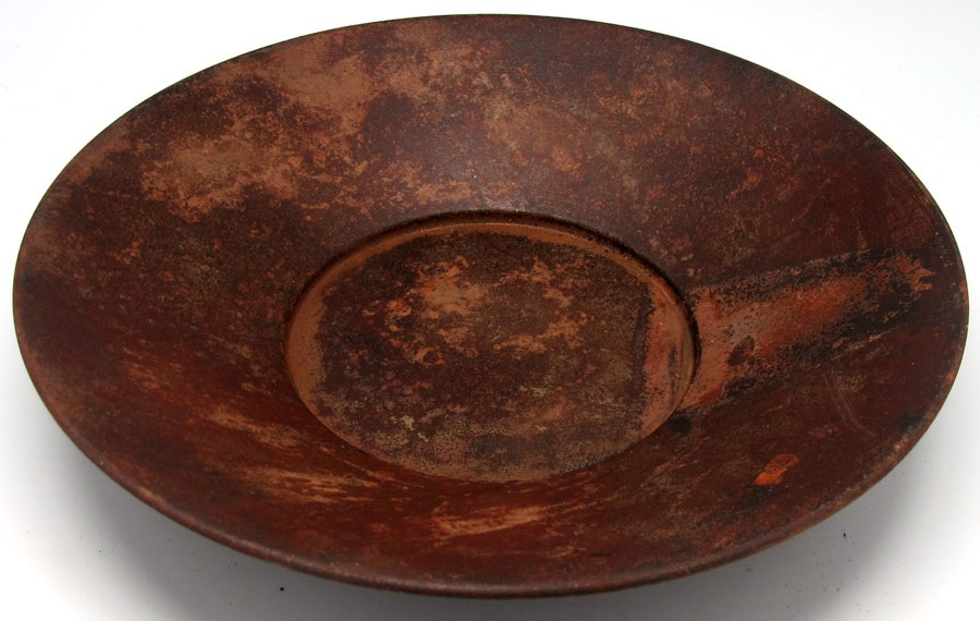12" in diameter, solid metal with antique rusty finish.