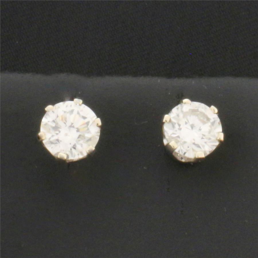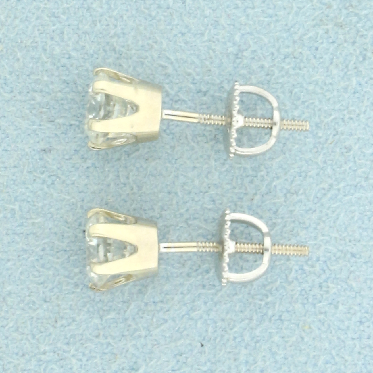 In 14K White Gold. Each earring contains one high quality round brilliant .62ct diamond, SI1 clarity/H color, completely eye clean and great cut for lots of sparkle. Basket setting. Screw backs for extra security. 1.6g
