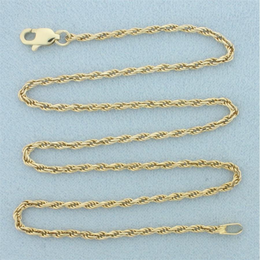 In 14k yellow gold. 1.9mm thick rope link. 14.52 inches long. Lobster clasp. 4.7g.