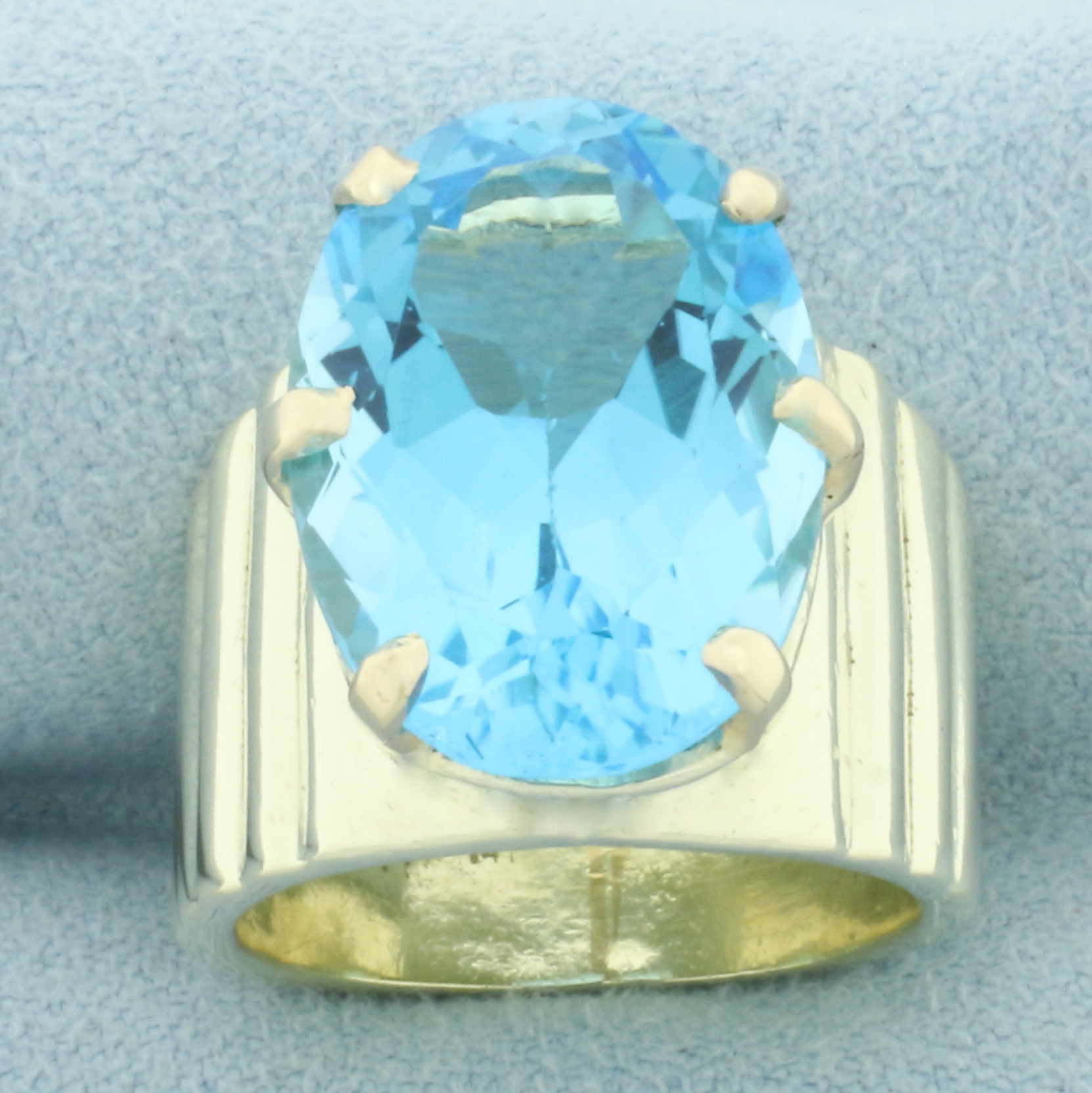 In 14k Yellow Gold. Contains one high quality natural 18mmx13mm Swiss Blue Topaz gemstone, approximately 14cts, with electric blue color and excellent clarity. Size 6. 16.4g.