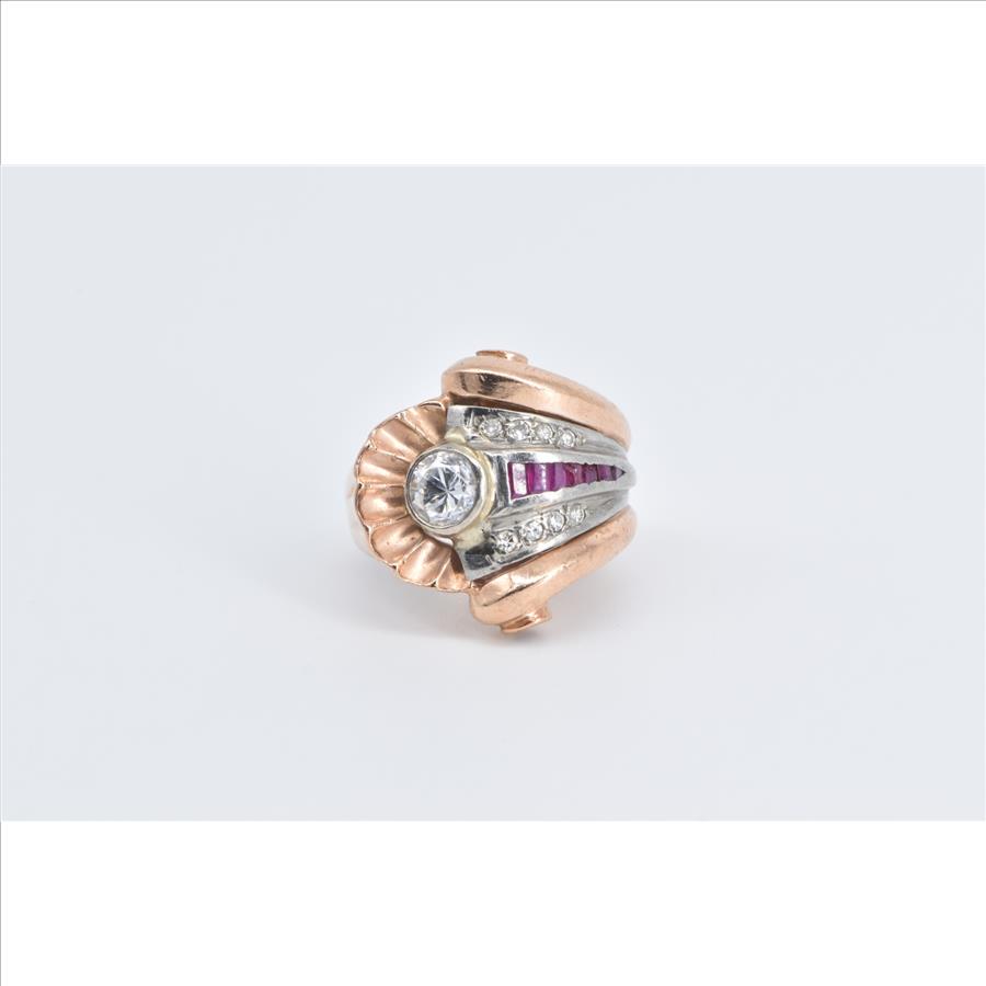 Item:  14K 1930's Scallop Sea Shell Ruby CZ Diamond Rose Gold Ring, Size 3.5