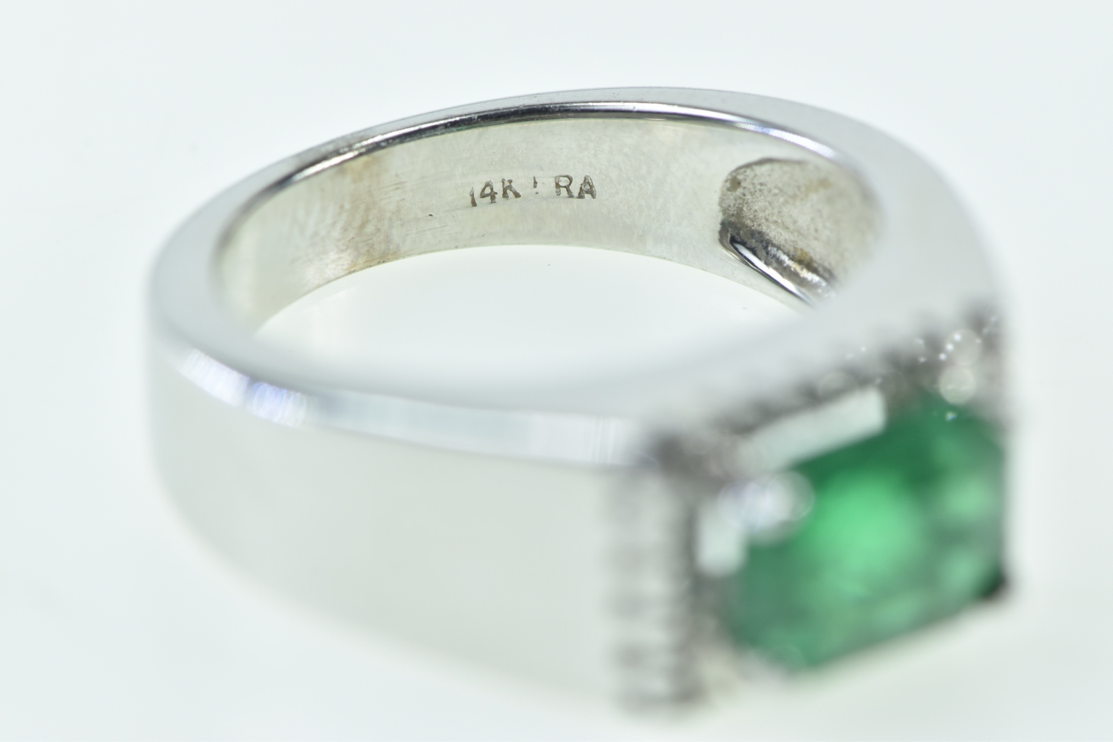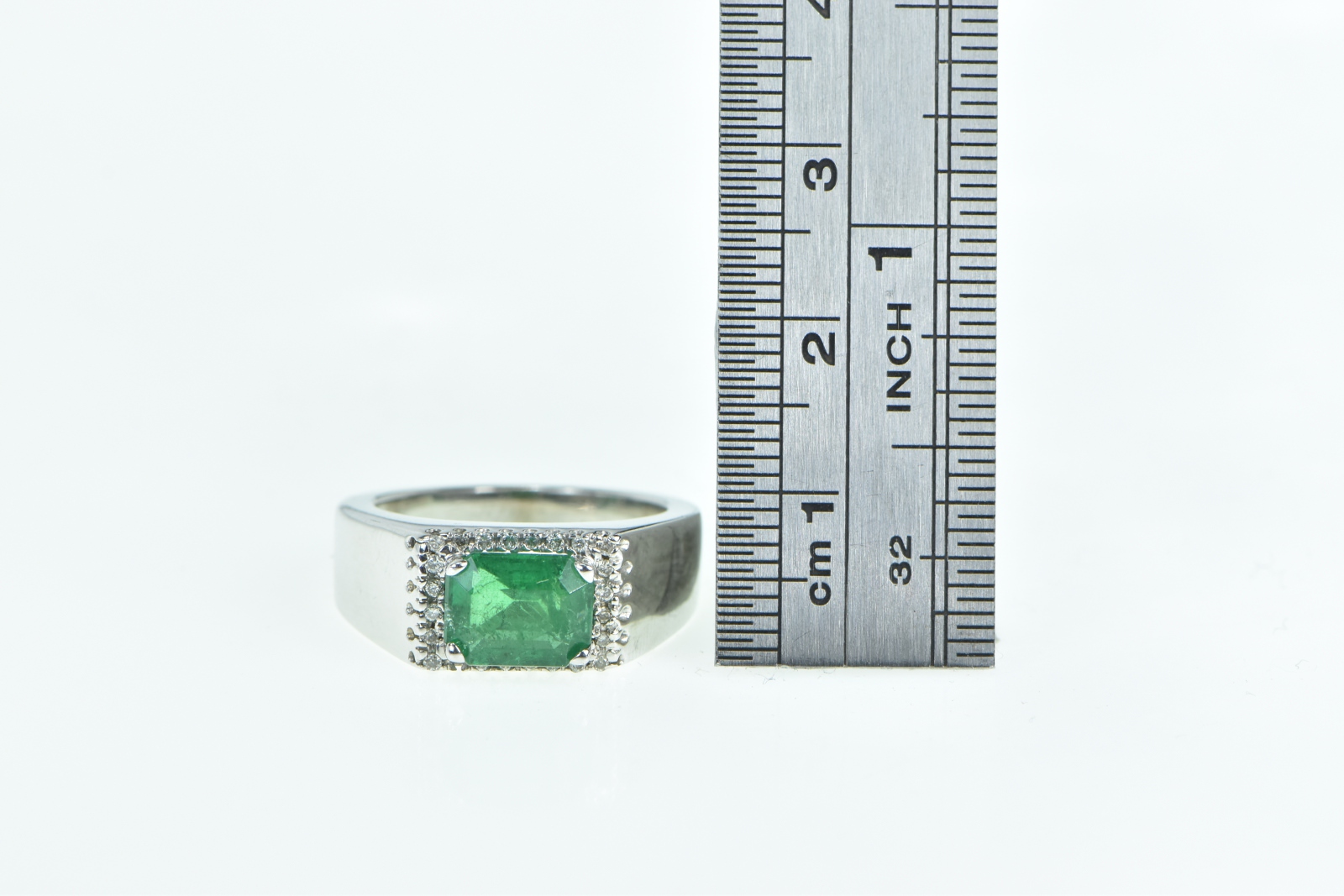 Item:  14K 1.98 Ctw Natural Emerald Diamond Halo Statement White Gold Ring, Size 6.75