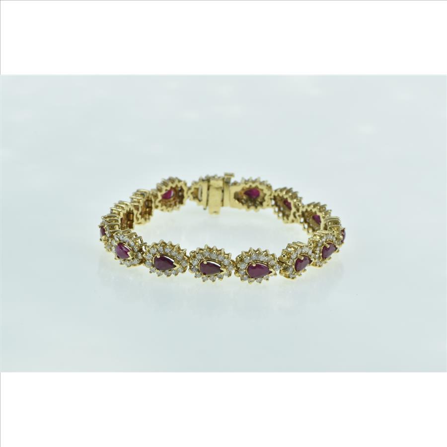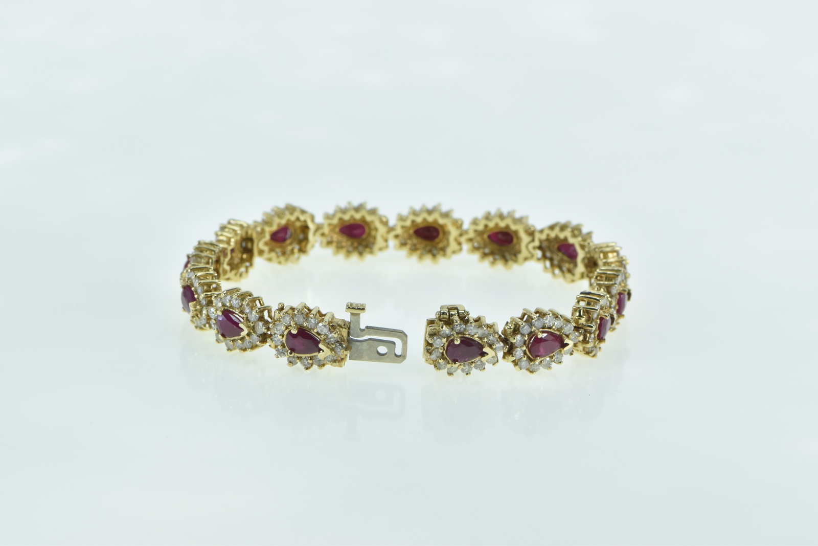 Item:  14K 9.90 Ctw Pear Ruby Diamond Halo Tennis Yellow Gold Bracelet 7"