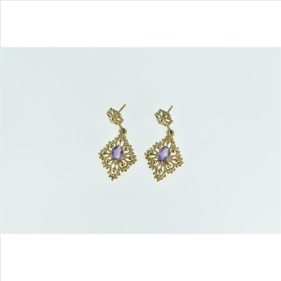 14K Amethyst Ornate Etruscan Revival Dangle Yellow Gold Earrings