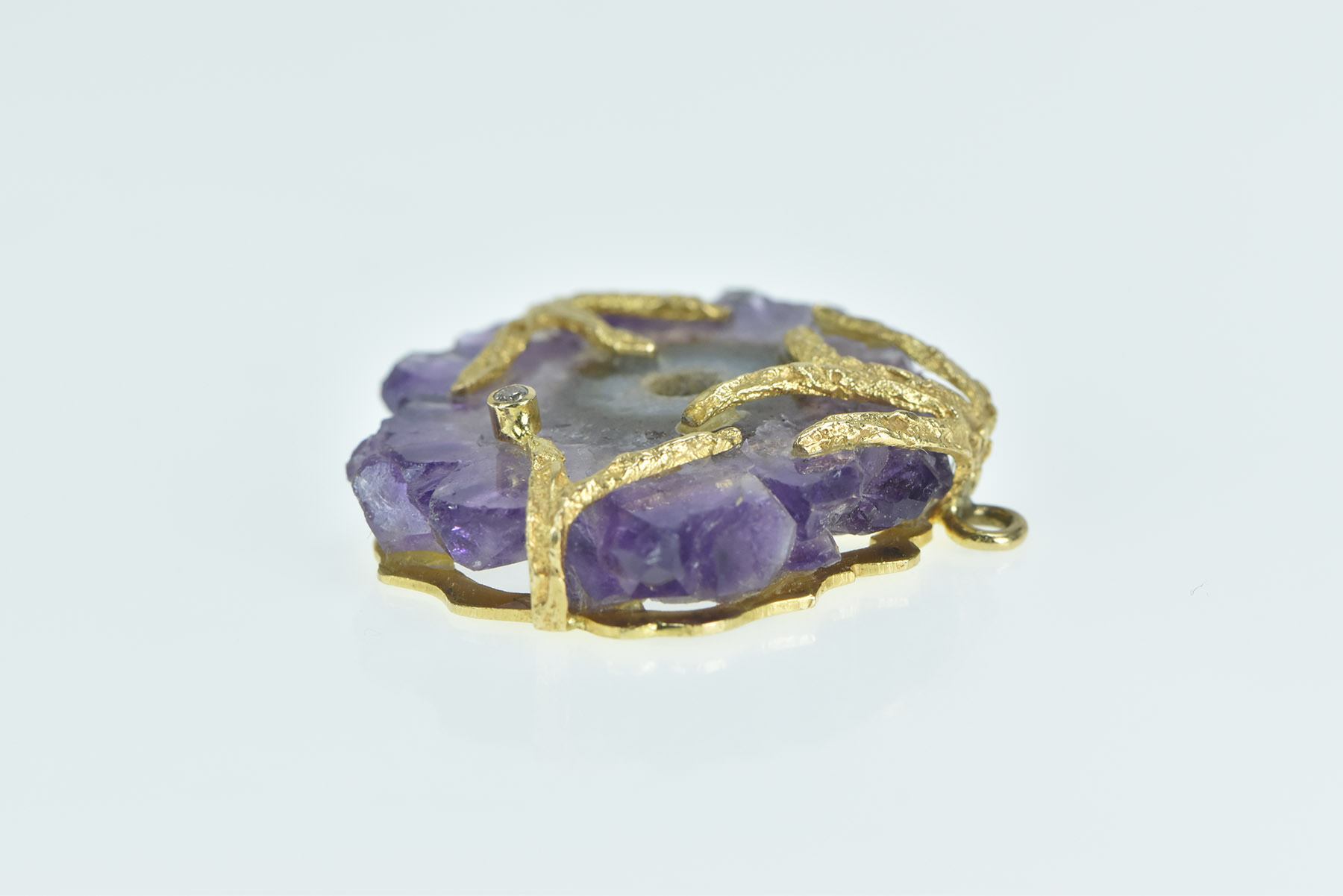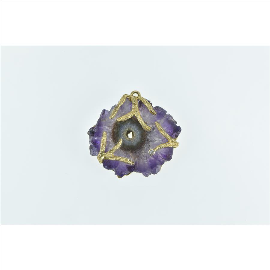 Item:  14K Amethyst Slice Geode Diamond Leaf Branch Yellow Gold Pendant
