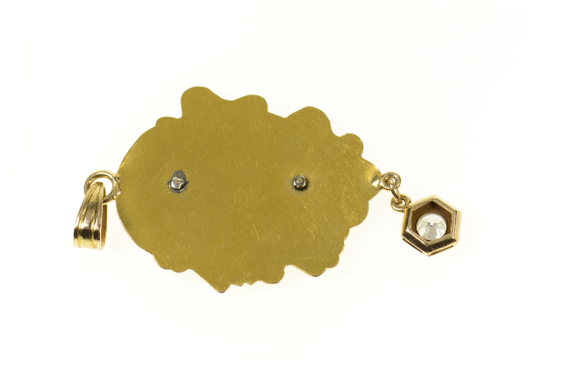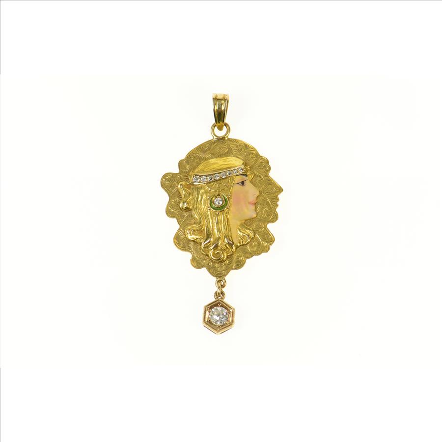 Item:  14K Art Nouveau Enamel Lady Etched Elaborate Yellow Gold Pendant