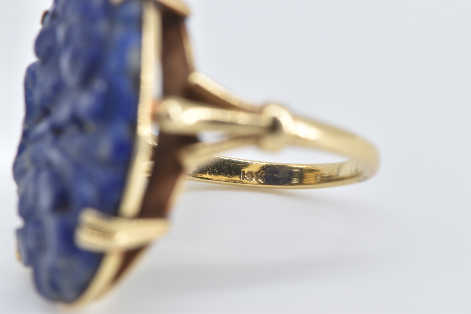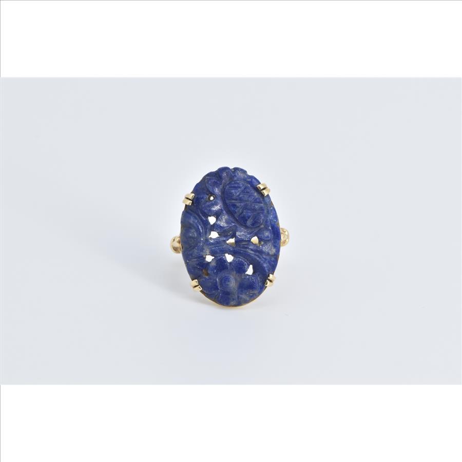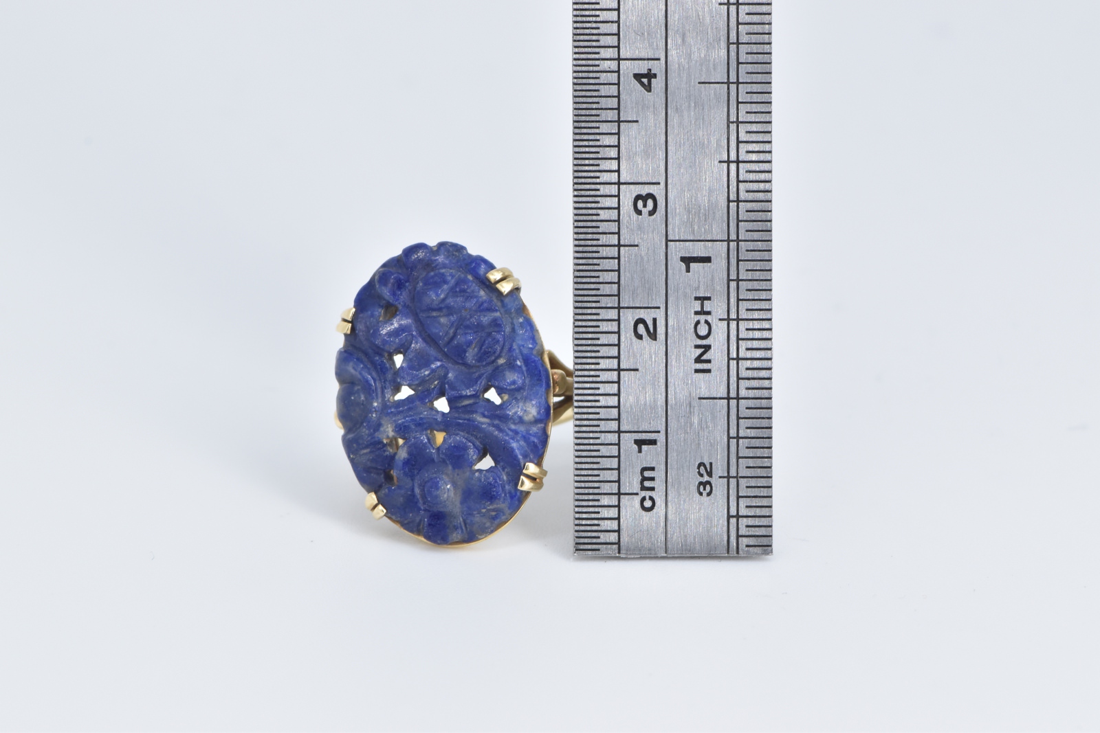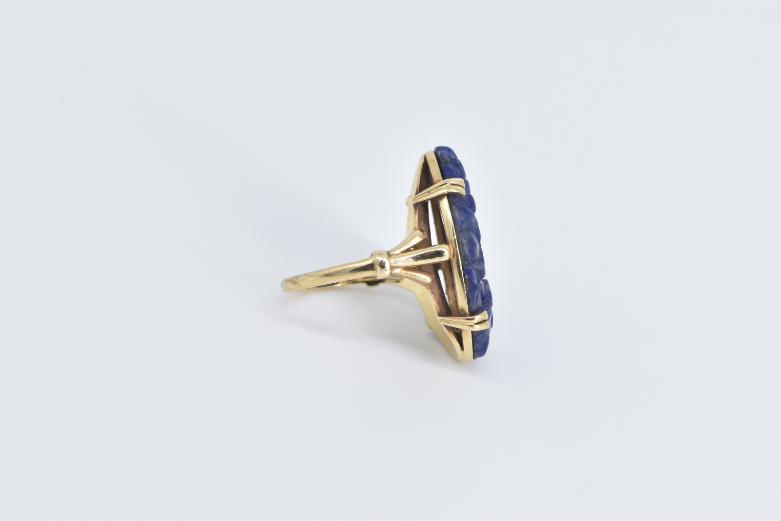 14K Carved Lapis Lazuli Floral Motif Ornate Oval Yellow Gold Ring, Size 7
