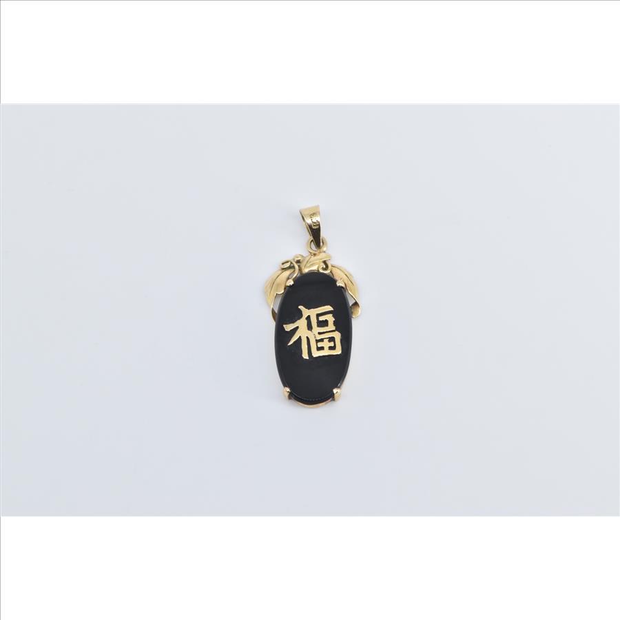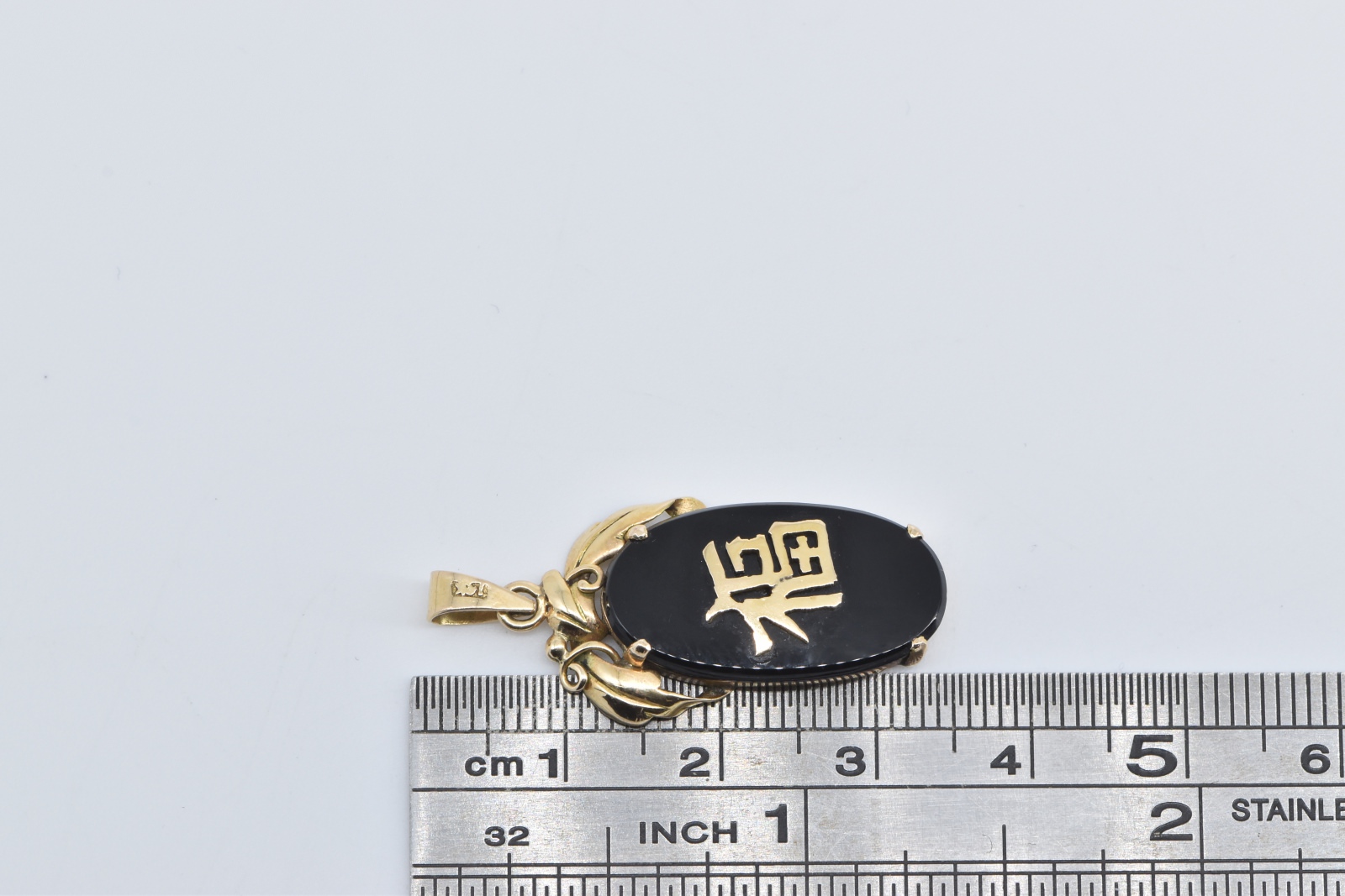 Item:  14K Chinese Fortune Character Black Onyx Ornate Yellow Gold Pendant
