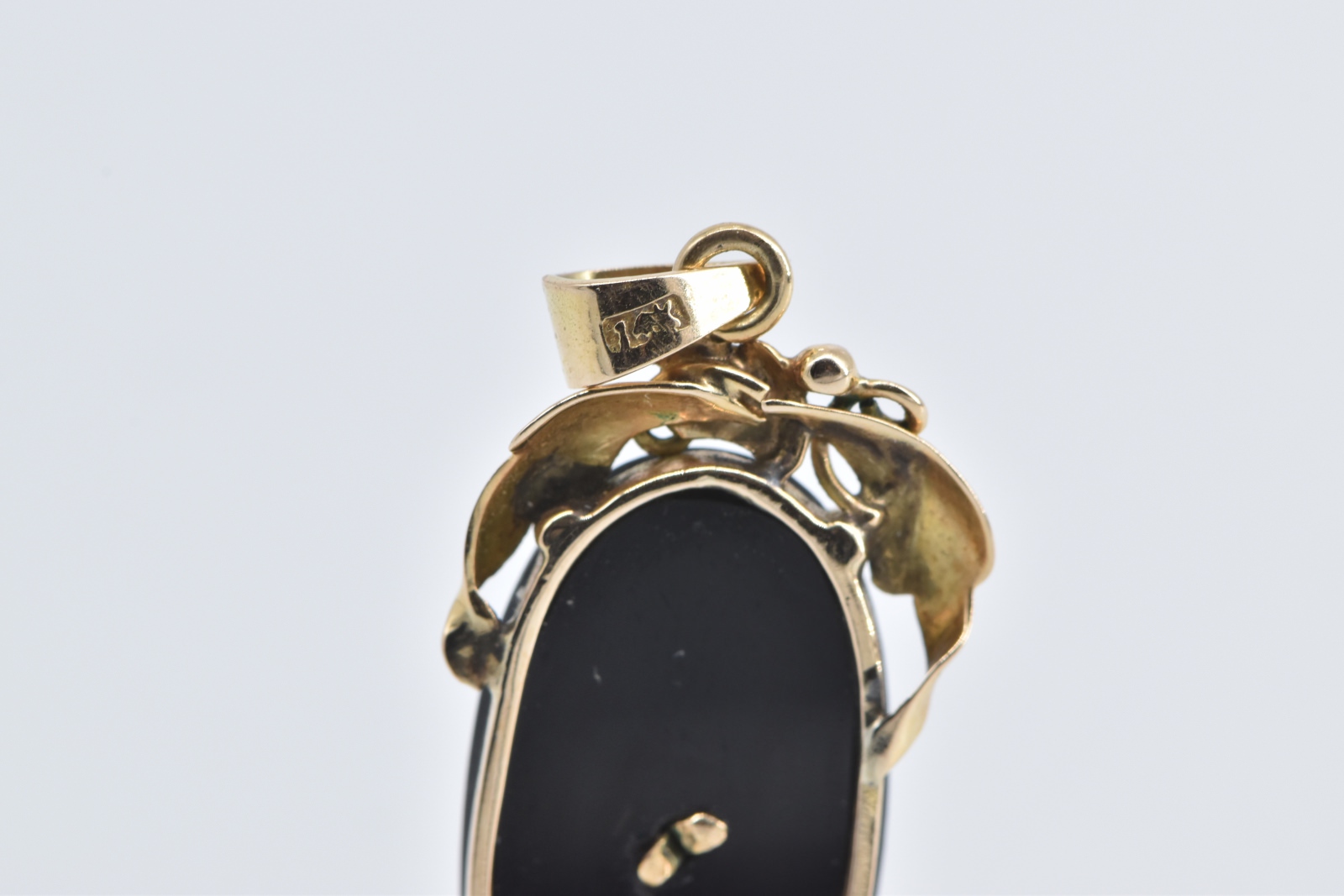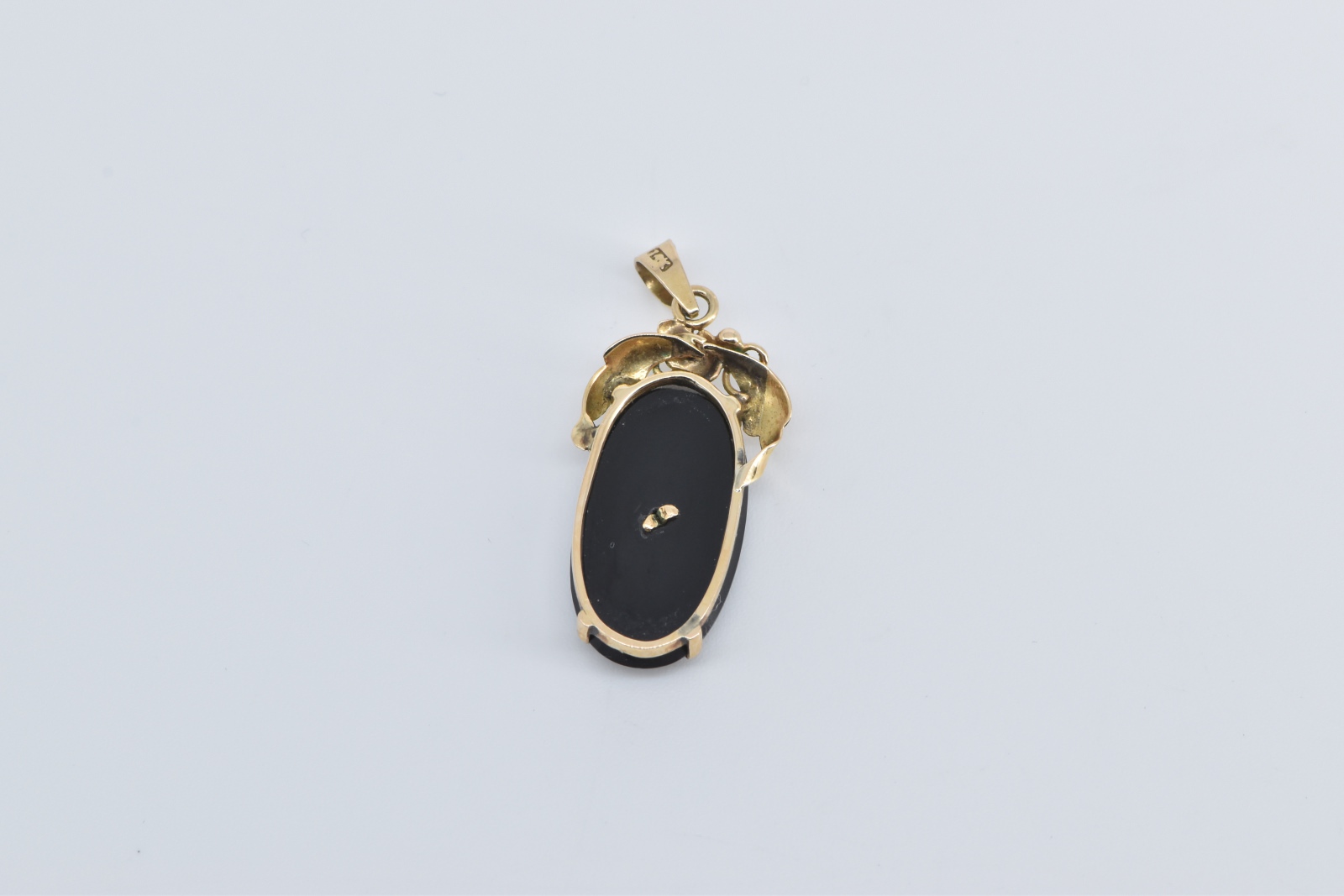 14K Chinese Fortune Character Black Onyx Ornate Yellow Gold Pendant