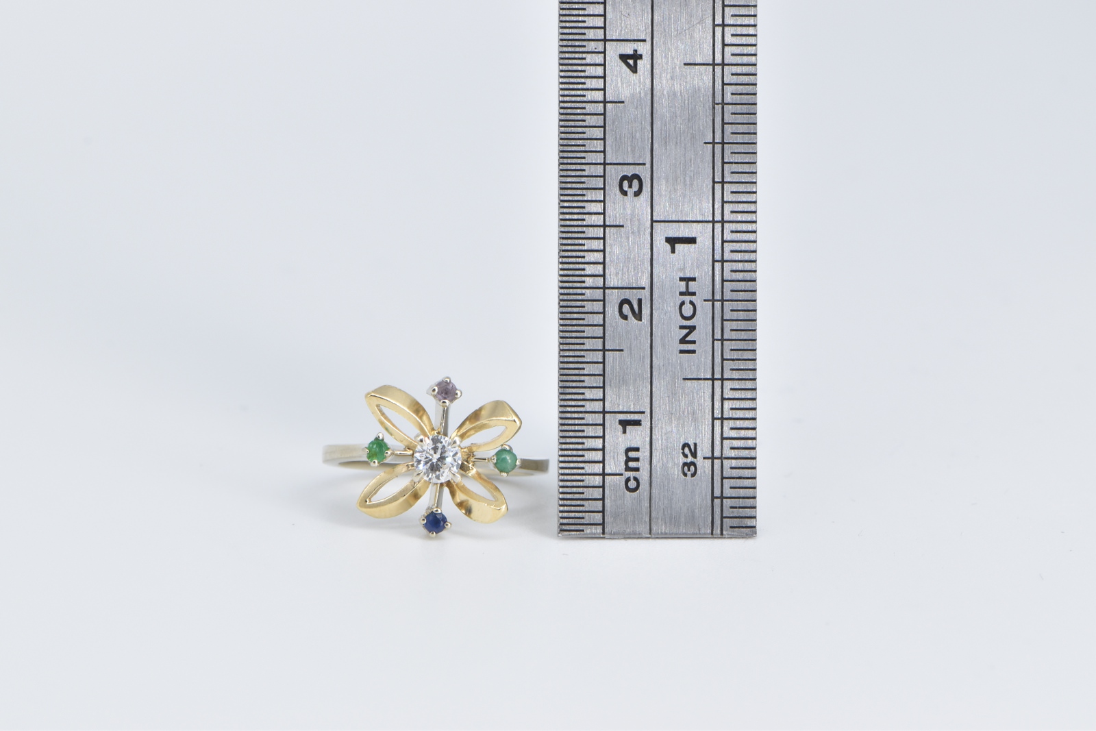 14K Diamond Emerald Ruby Sapphire Flower Yellow Gold Ring, Size 4.75