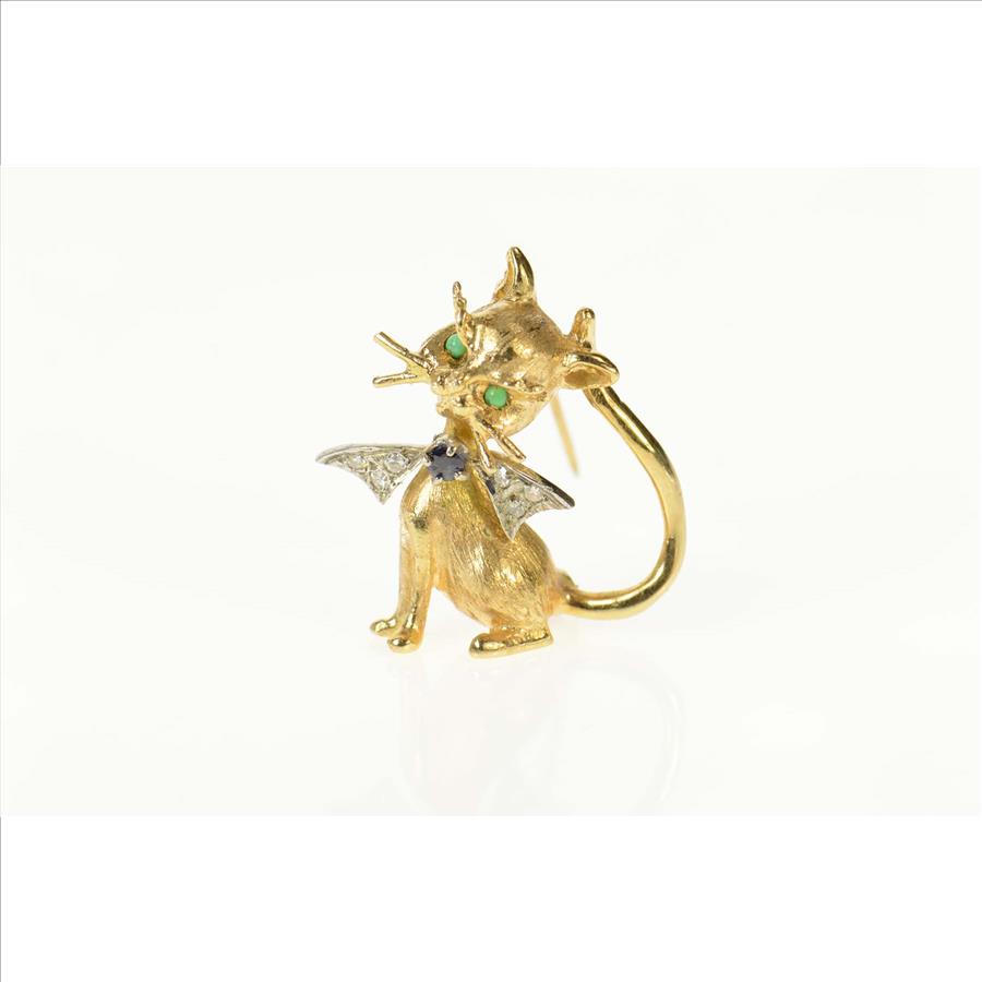 14K Diamond Sapphire Emerald Cat Kitty Retro Yellow Gold Pin/Brooch