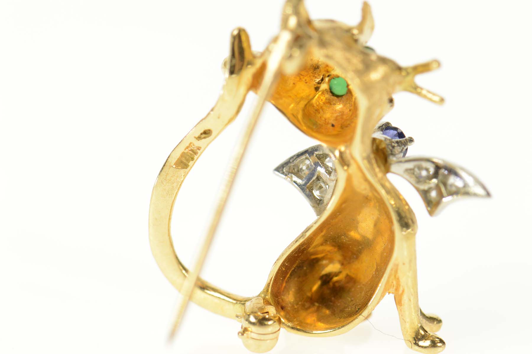 Item:  14K Diamond Sapphire Emerald Cat Kitty Retro Yellow Gold Pin/Brooch