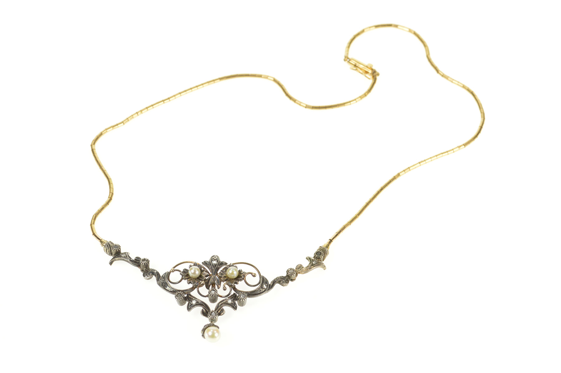 Item:  14K Edwardian Diamond Pearl Scroll Pendant Yellow Gold Necklace 16.25"