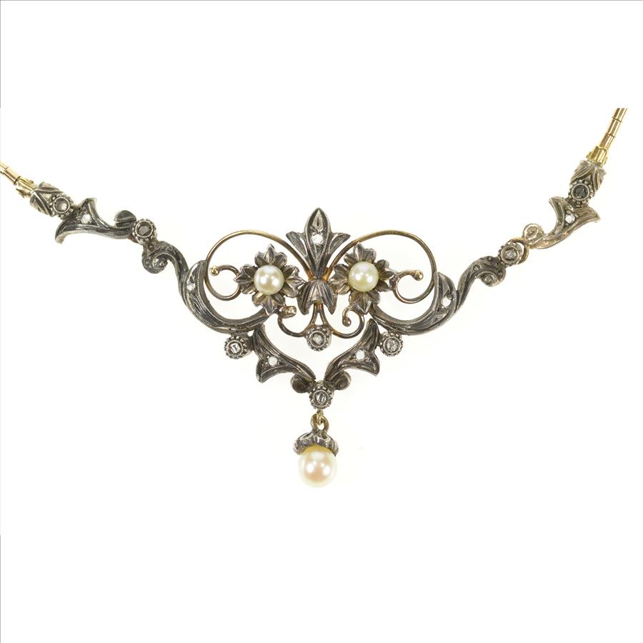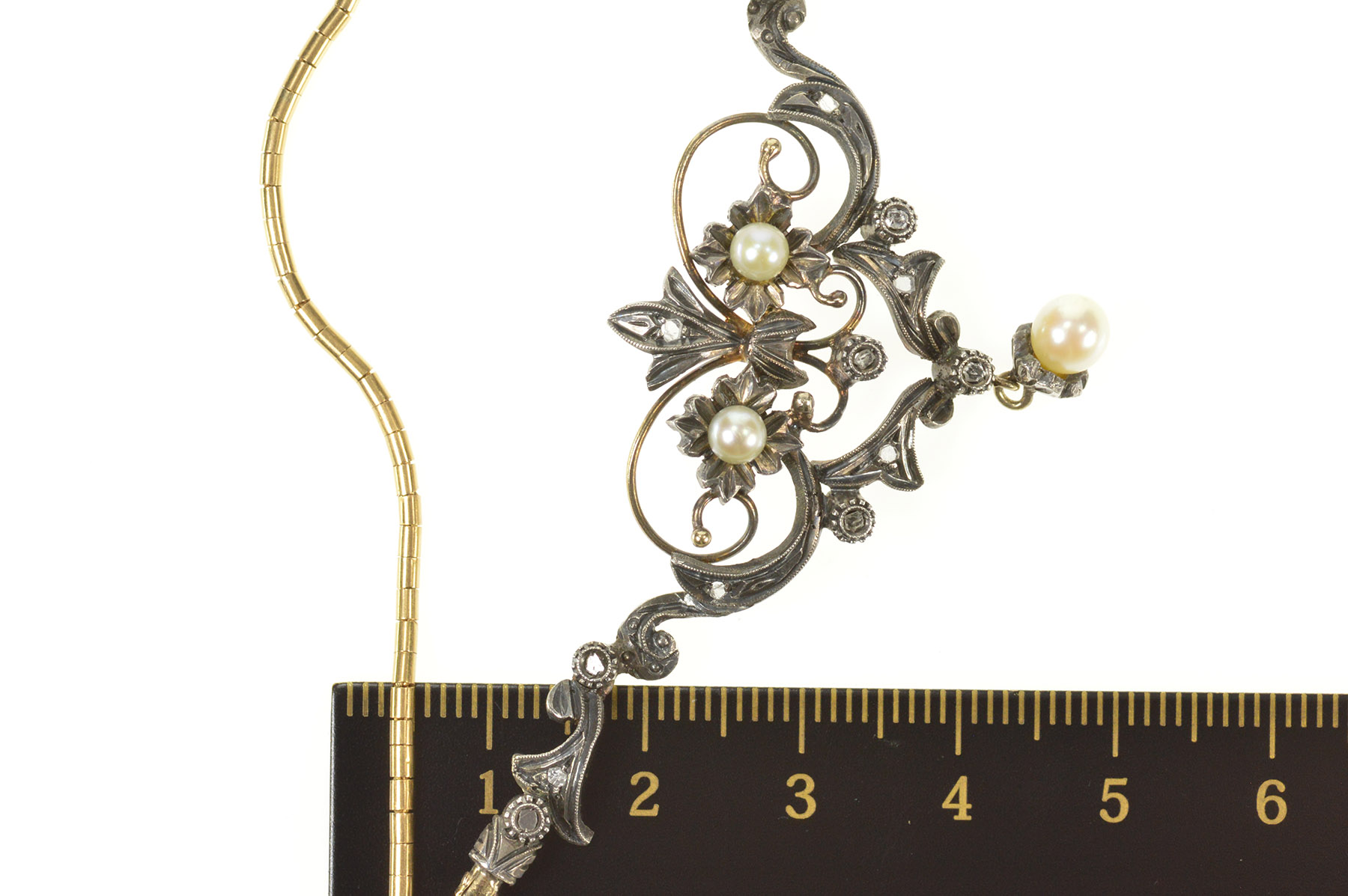 Item:  14K Edwardian Diamond Pearl Scroll Pendant Yellow Gold Necklace 16.25"
