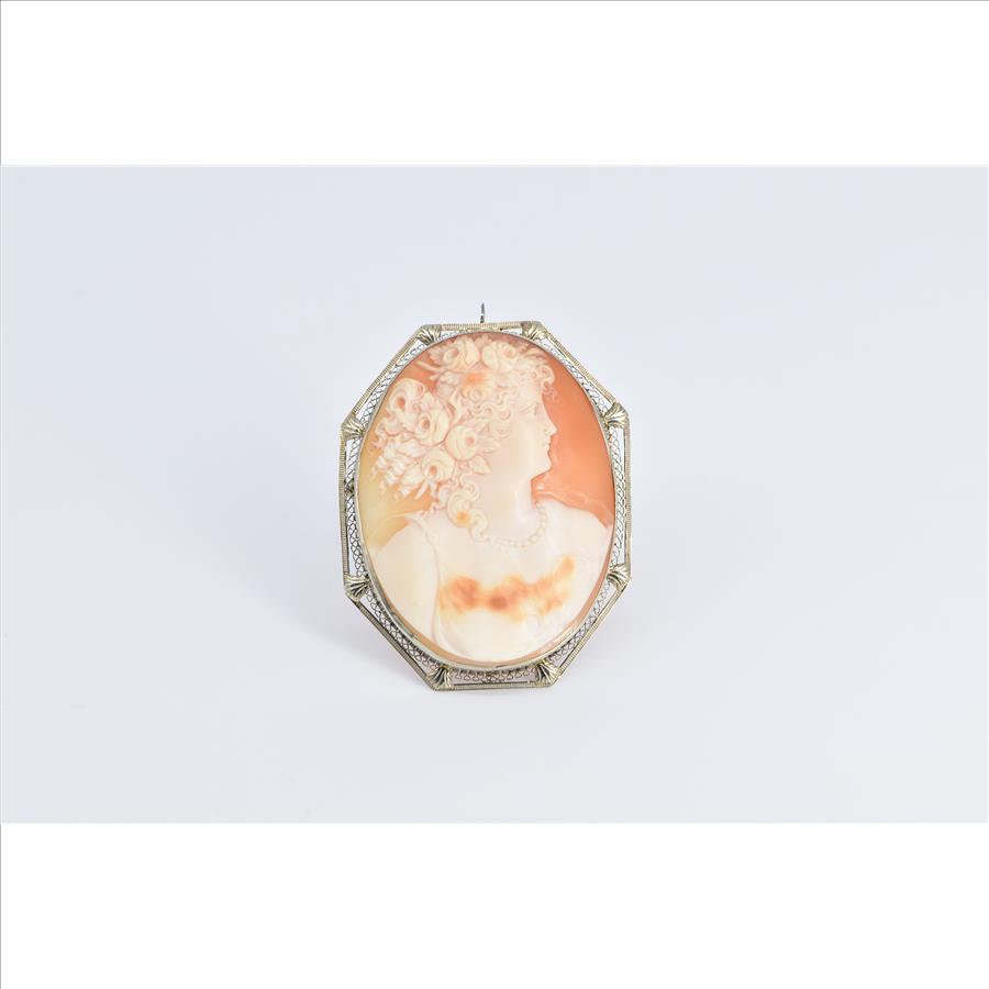 Item:  14K Elaborate Carved Shell Cameo Filigree White Gold Pendant/Pin