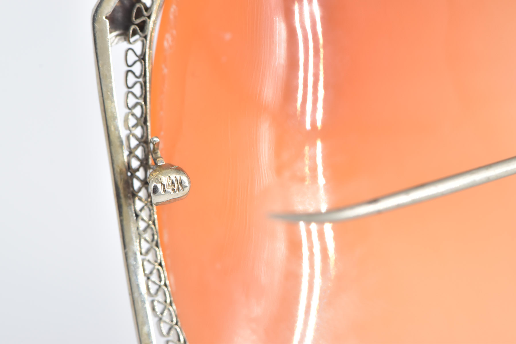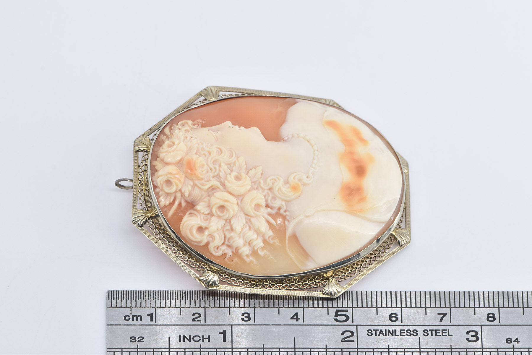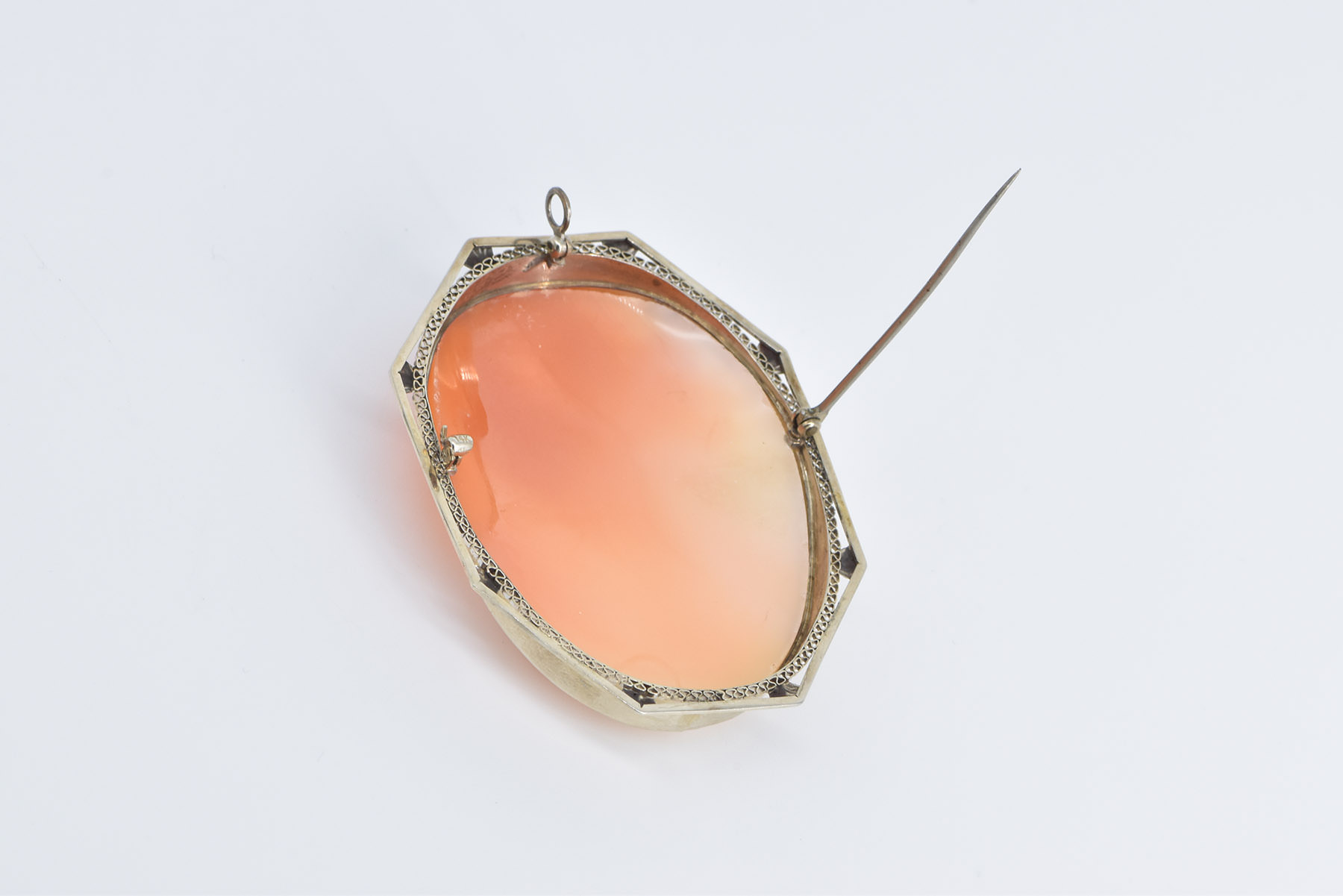 14K Elaborate Carved Shell Cameo Filigree White Gold Pendant/Pin
