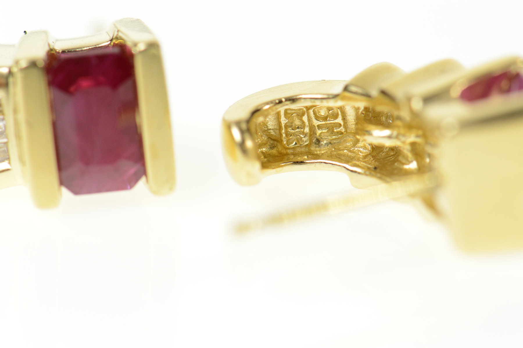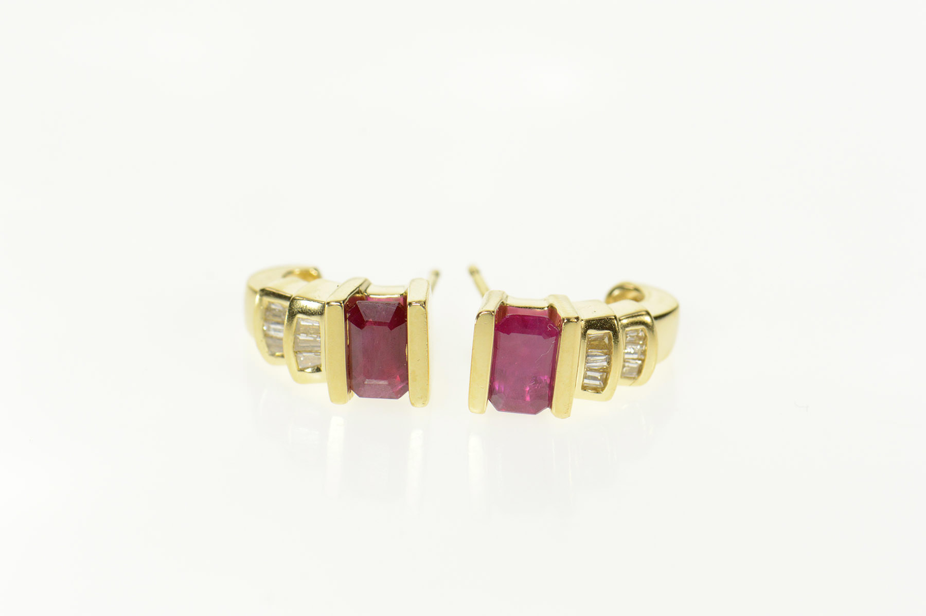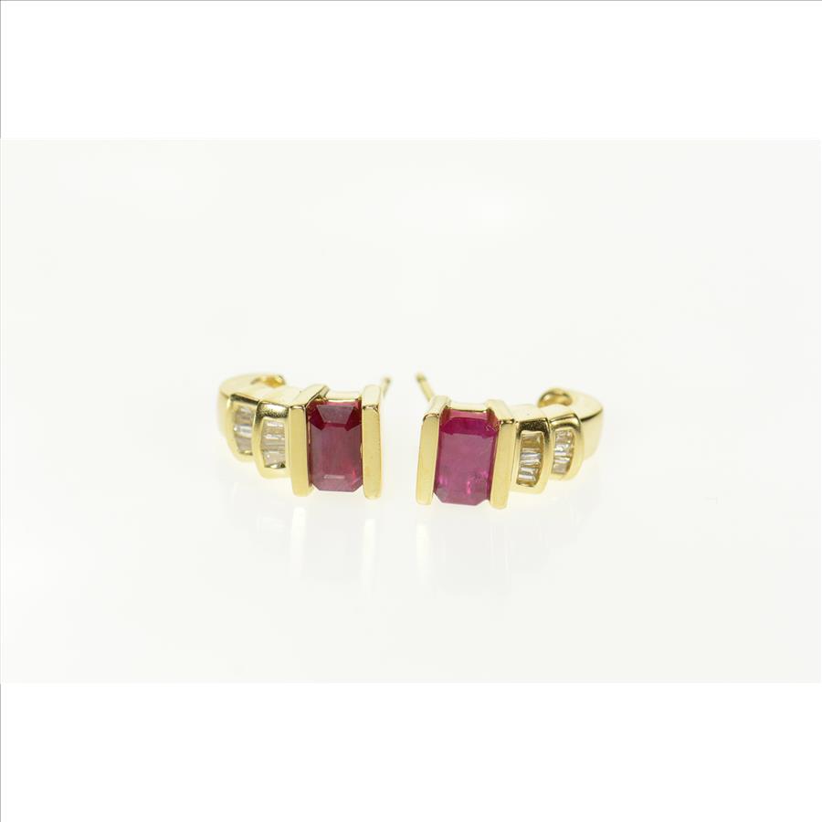 Item:  14K Emerald Cut Ruby Diamond Semi Hoop Stud Yellow Gold Earrings