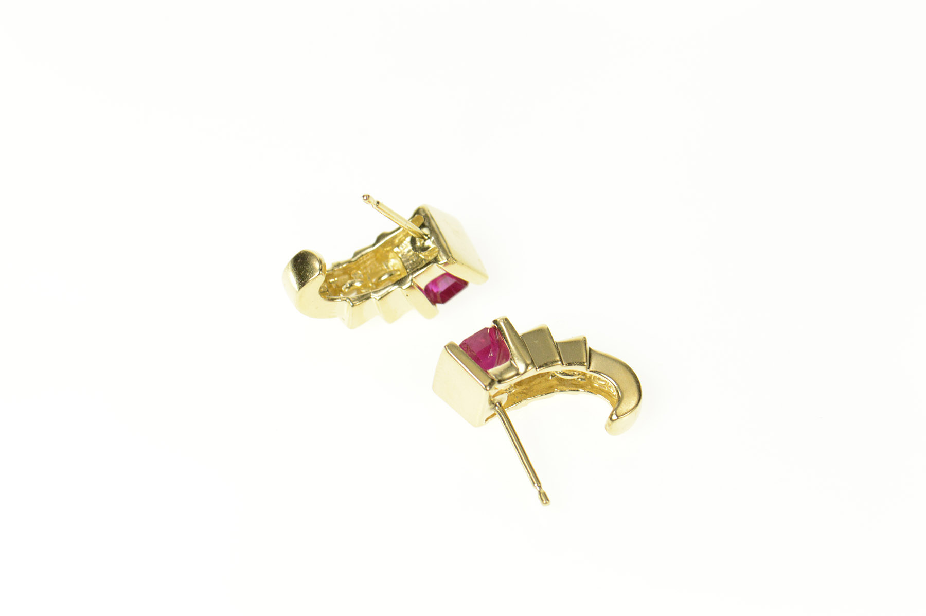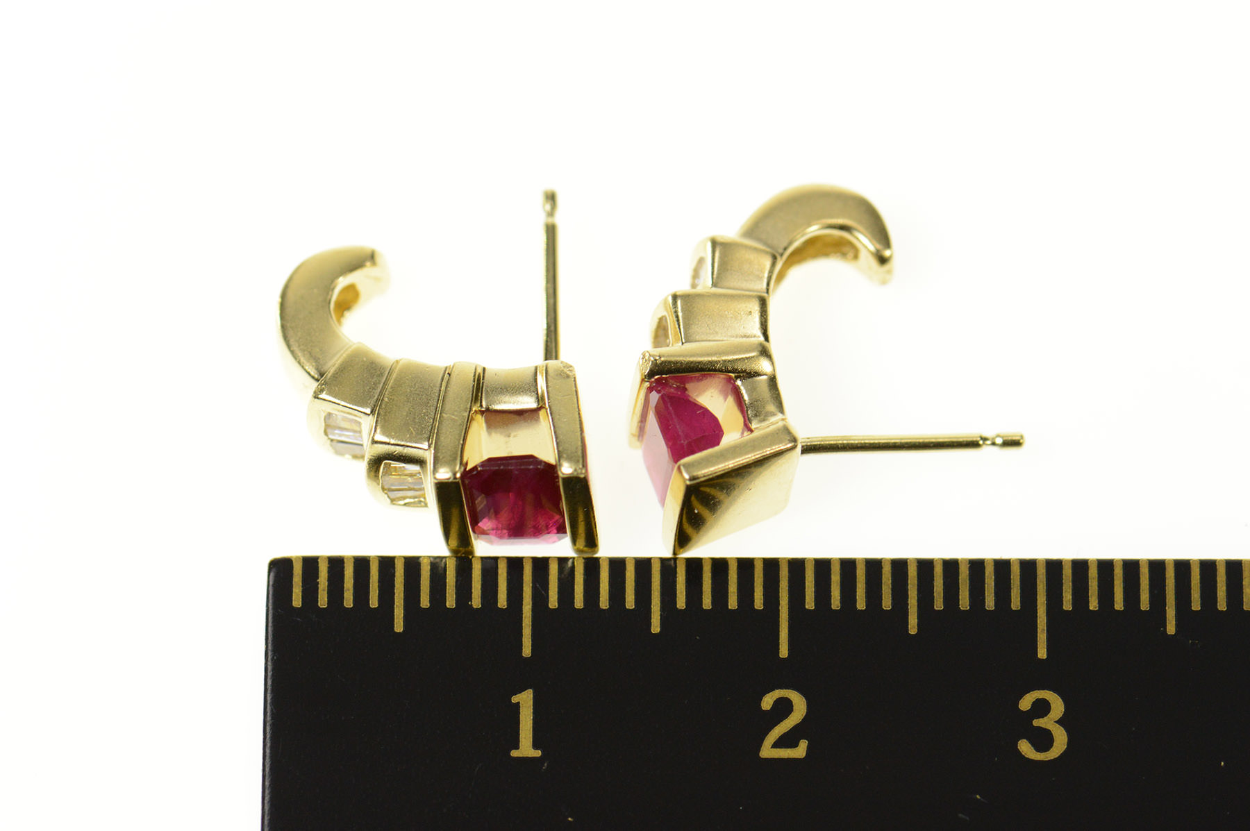 14K Emerald Cut Ruby Diamond Semi Hoop Stud Yellow Gold Earrings