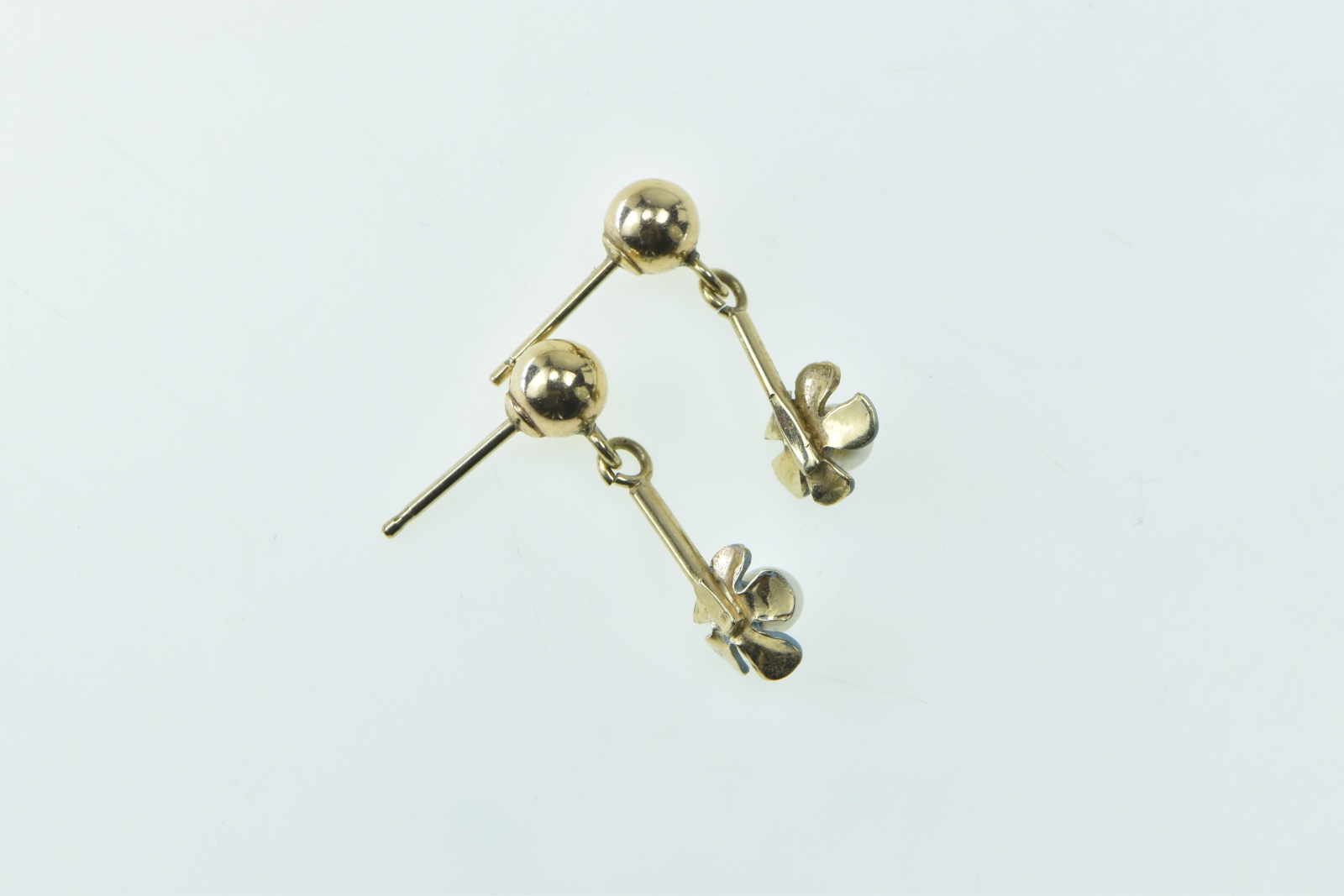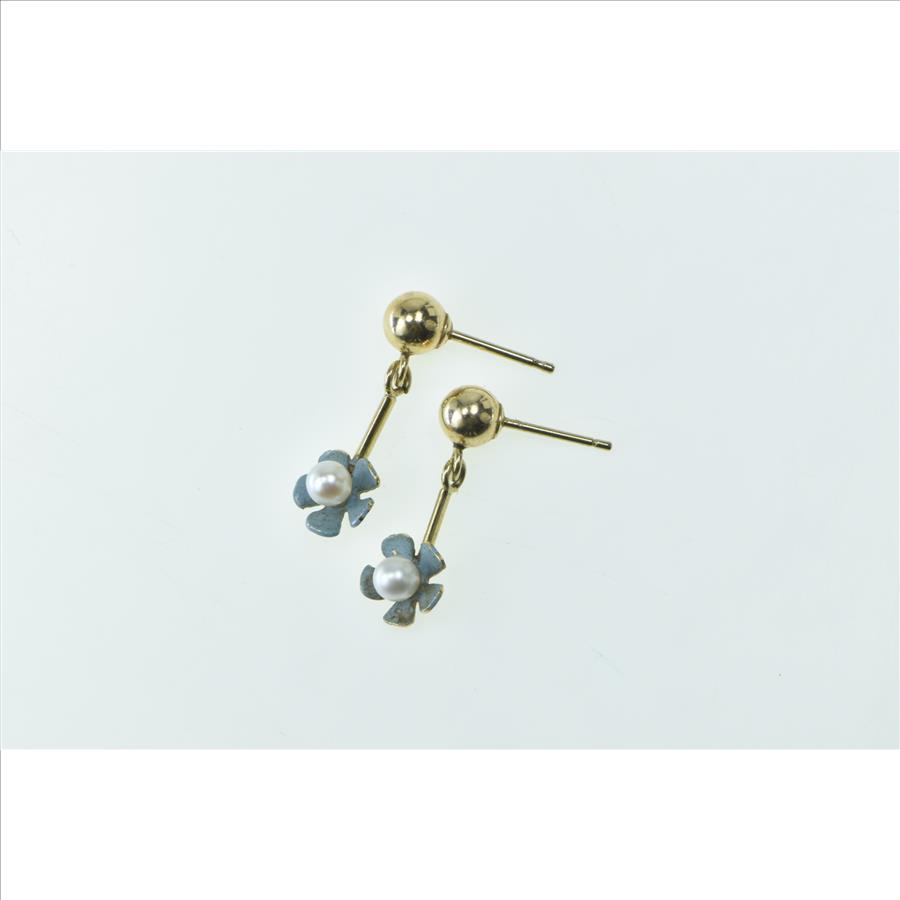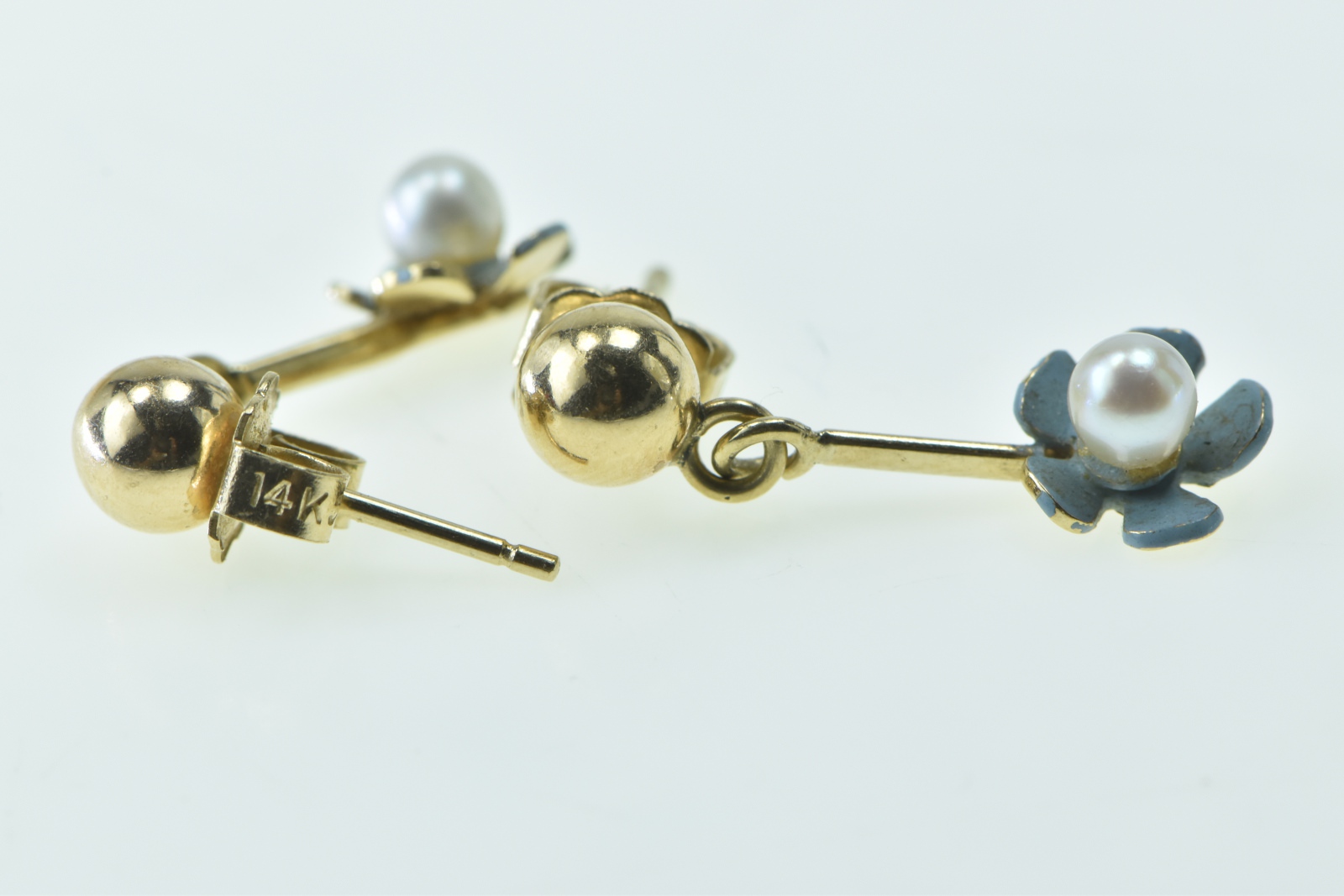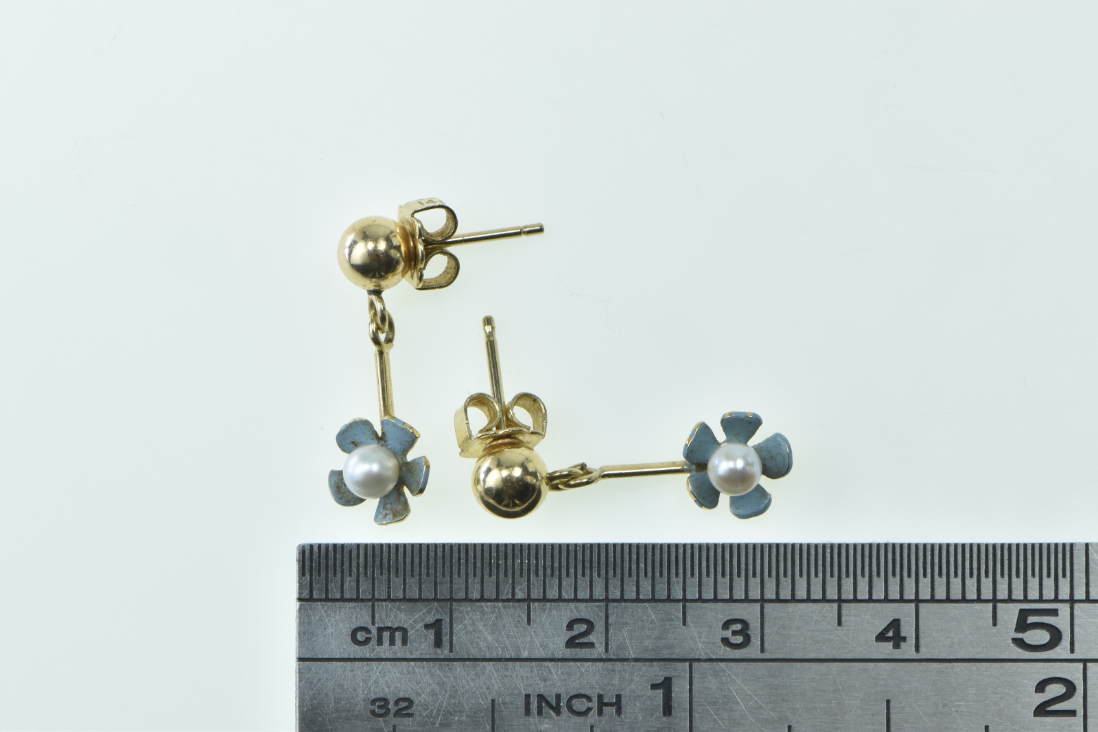 14K Forget Me Not Enamel Flower Pearl Dangle Yellow Gold Earrings