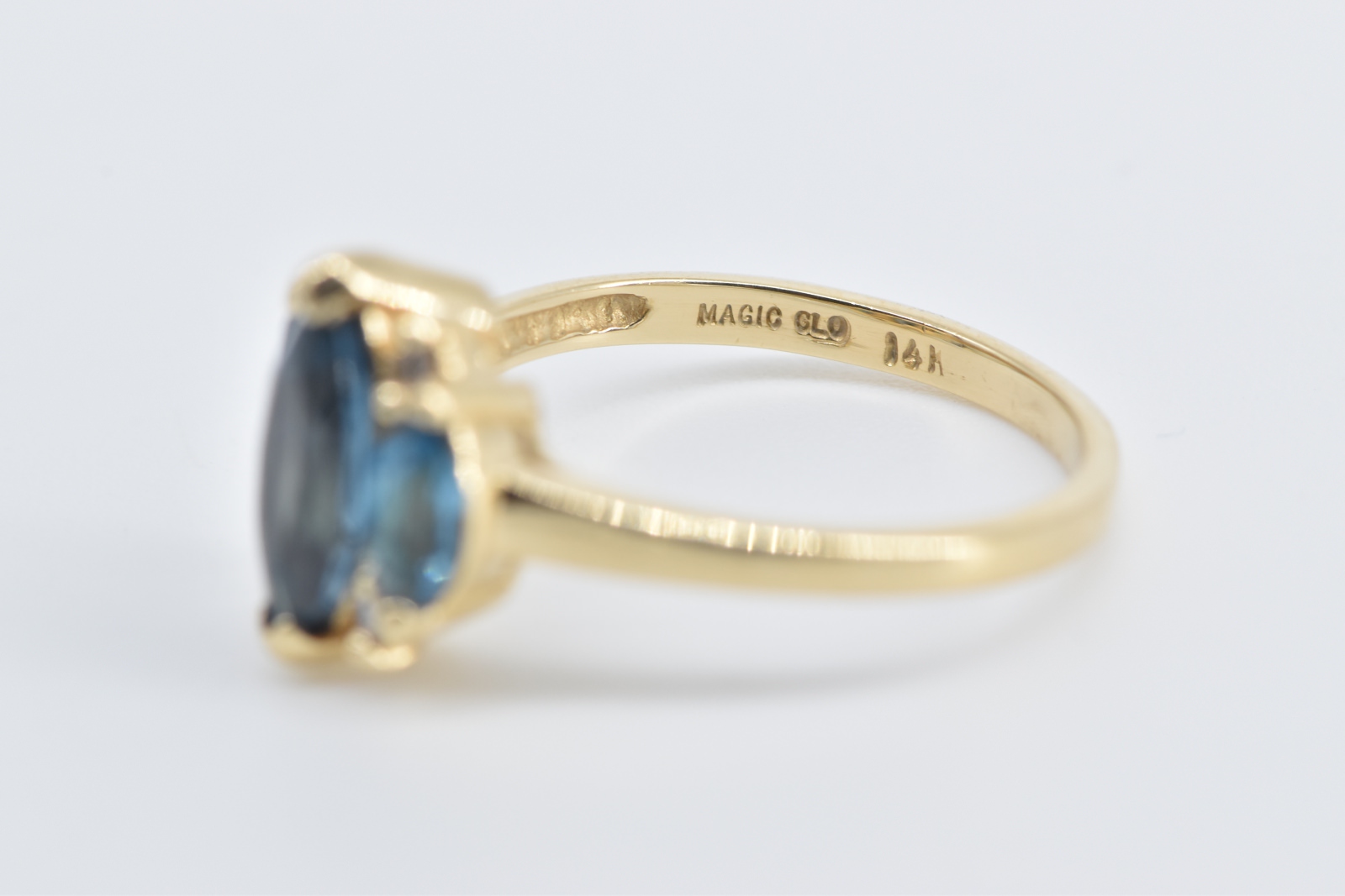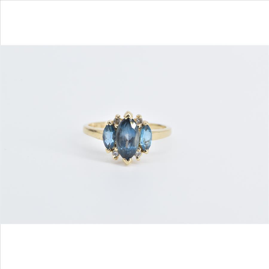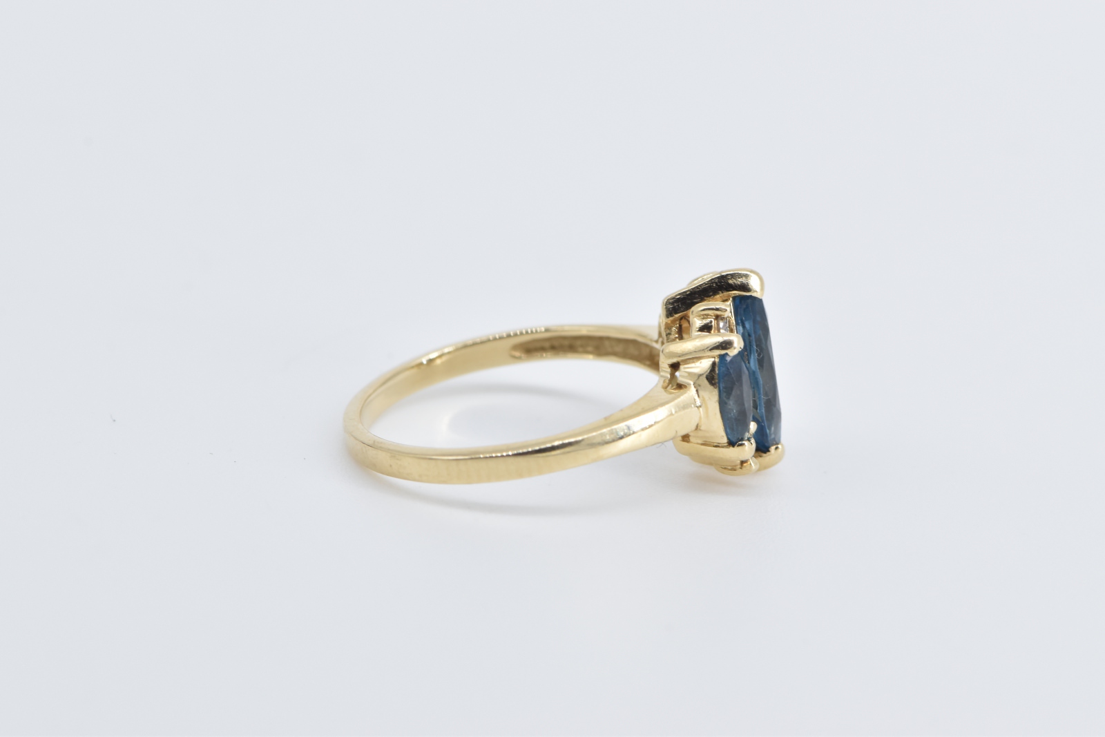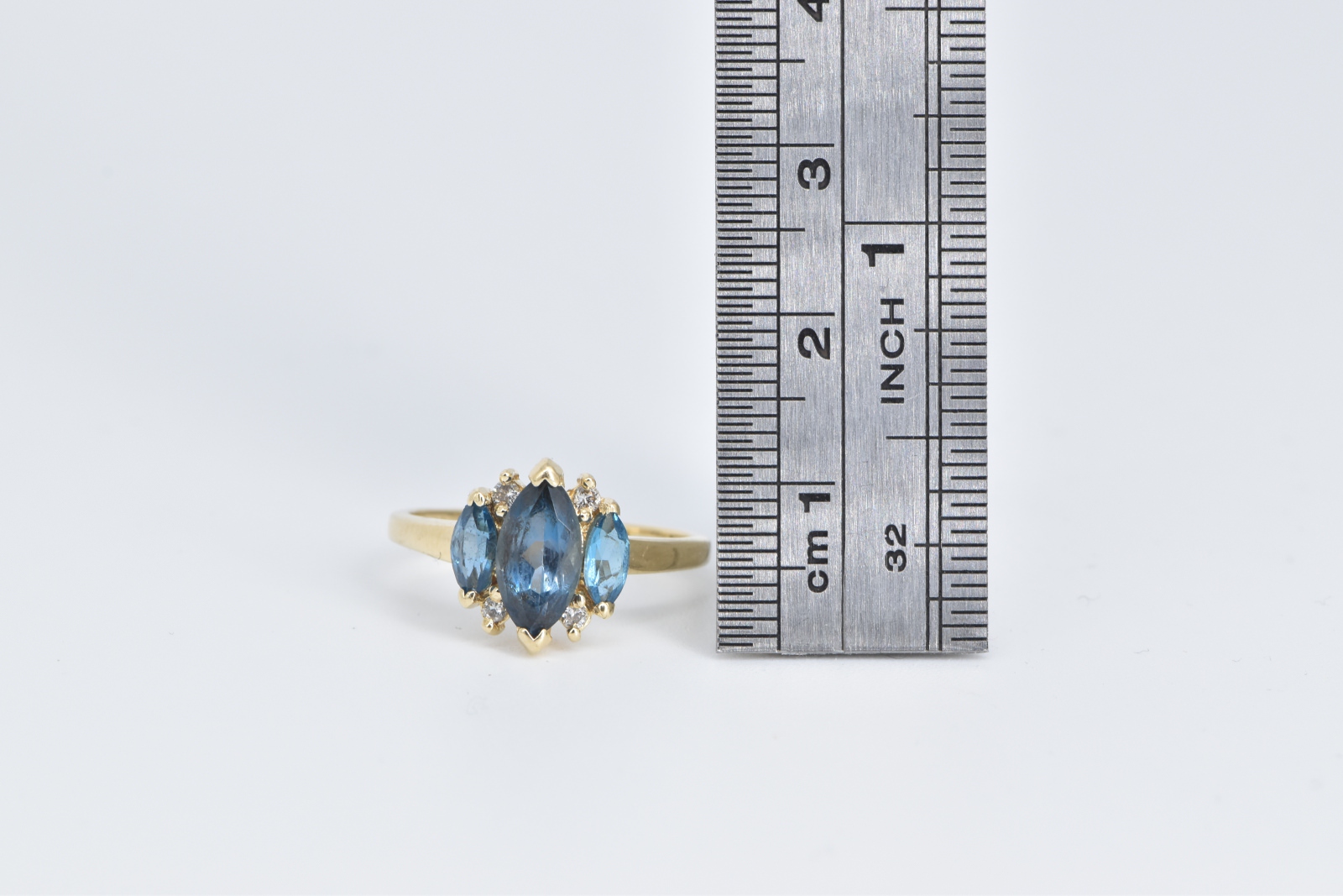 14K Marquise Blue Topaz Diamond Three Stone Yellow Gold Ring, Size 6.5