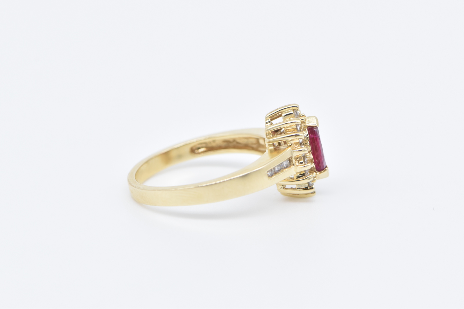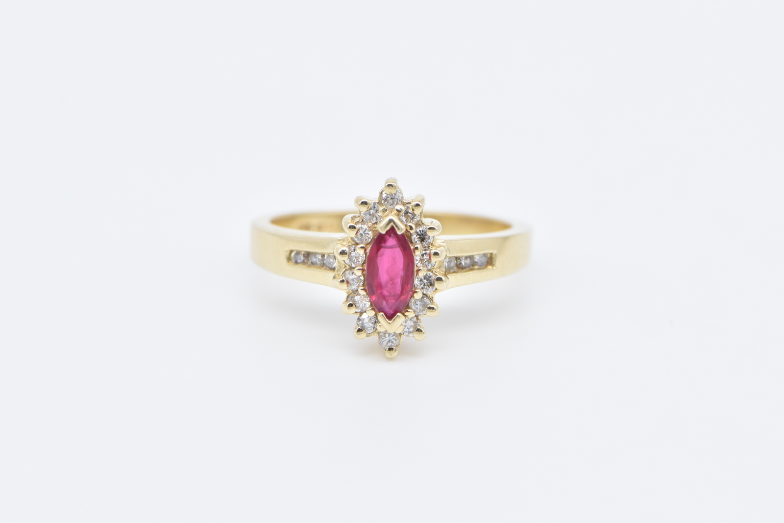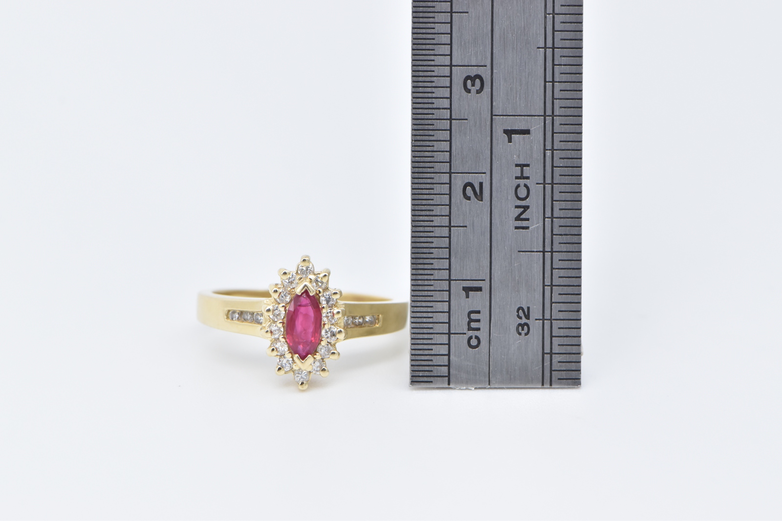 Item:  14K Marquise Ruby Diamond Halo Engagement Yellow Gold Ring, Size 7