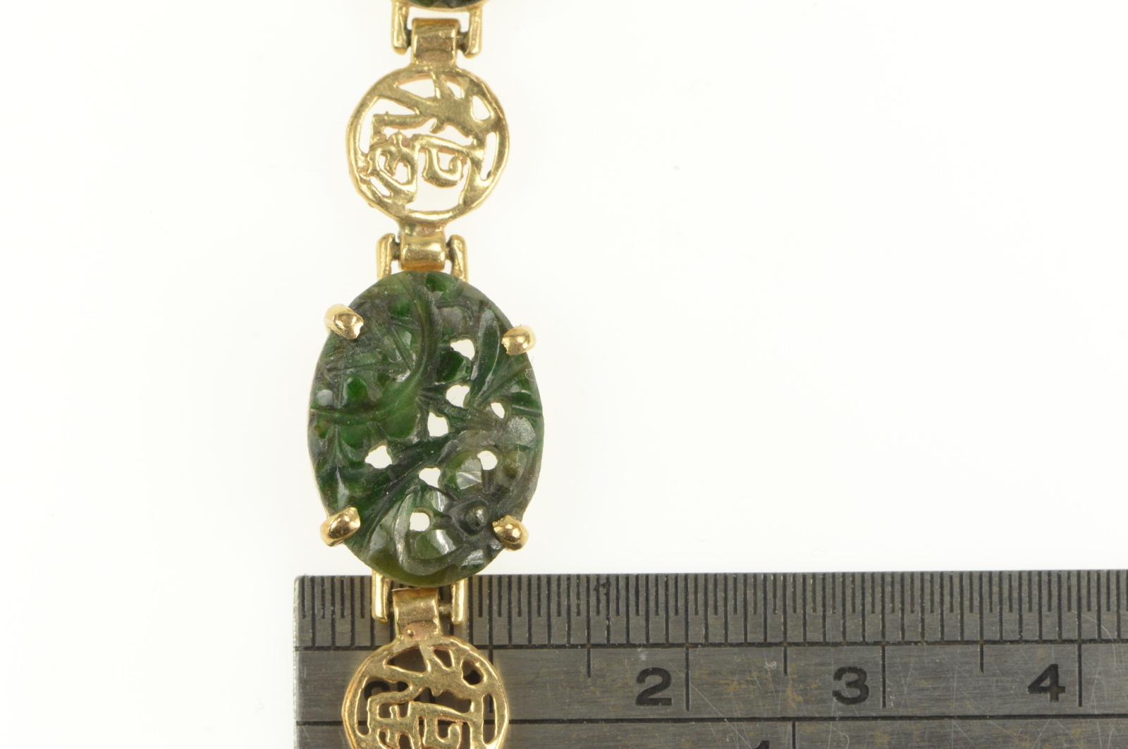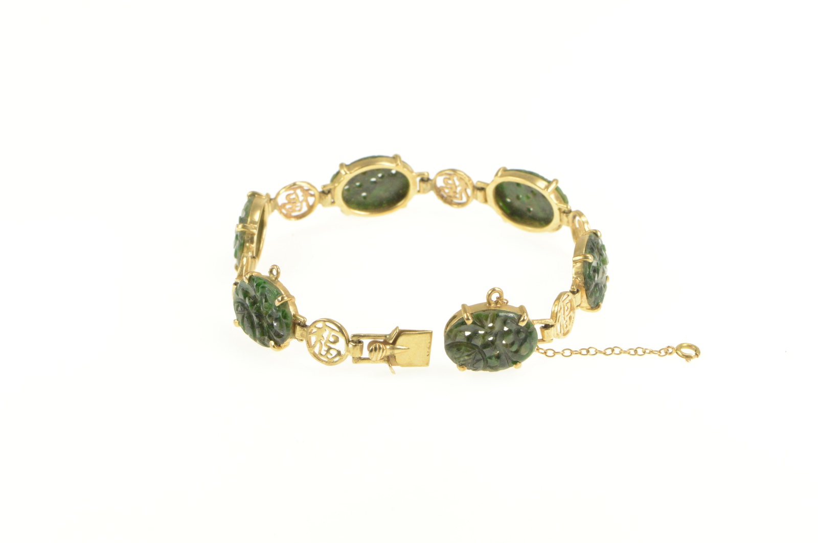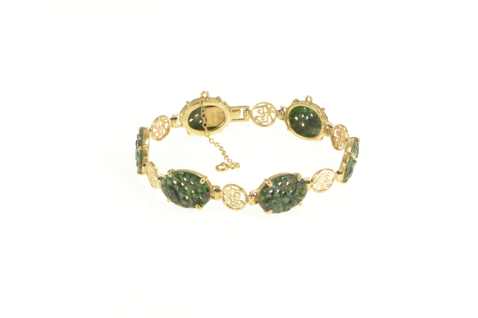 14K Nephrite Floral Carved Stone Chinese Yellow Gold Bracelet 7"