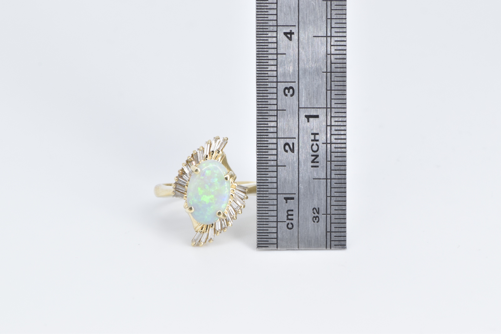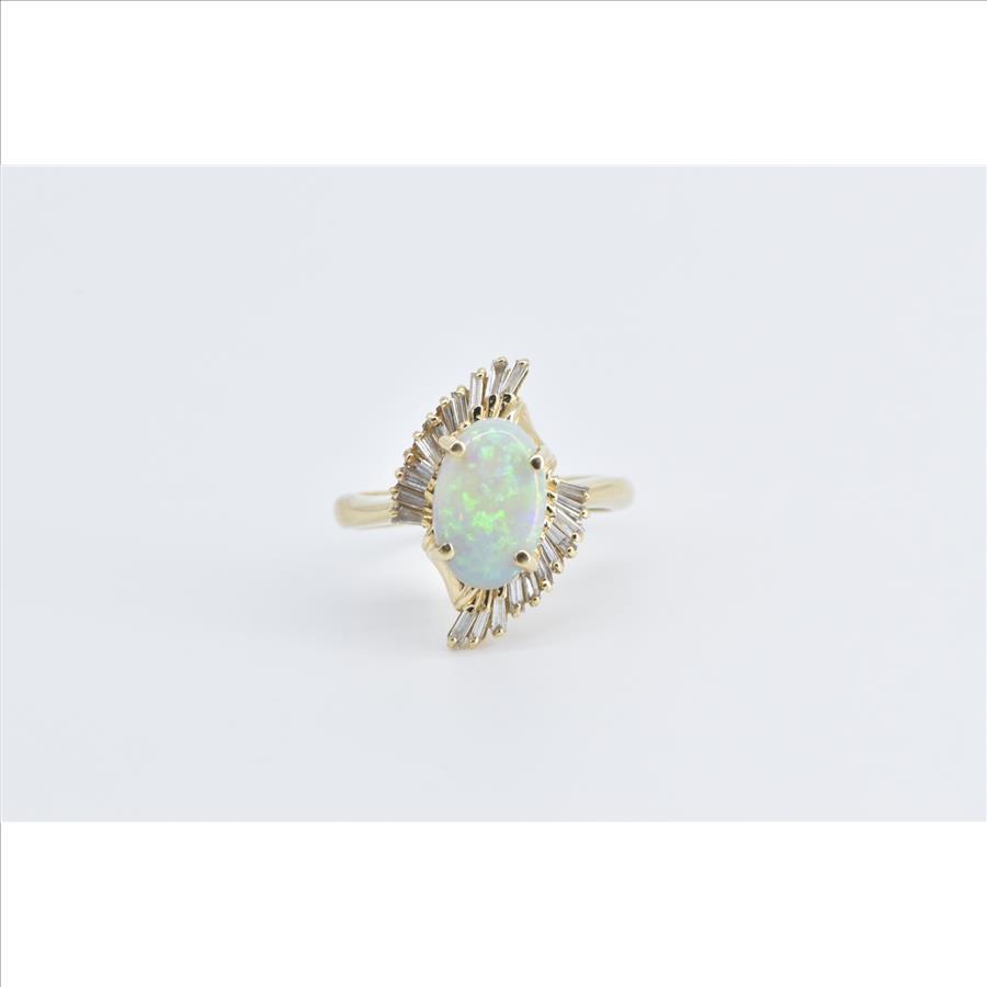 14K Opal Baguette Diamond Fanned Halo Swirl Yellow Gold Ring, Size 7.75