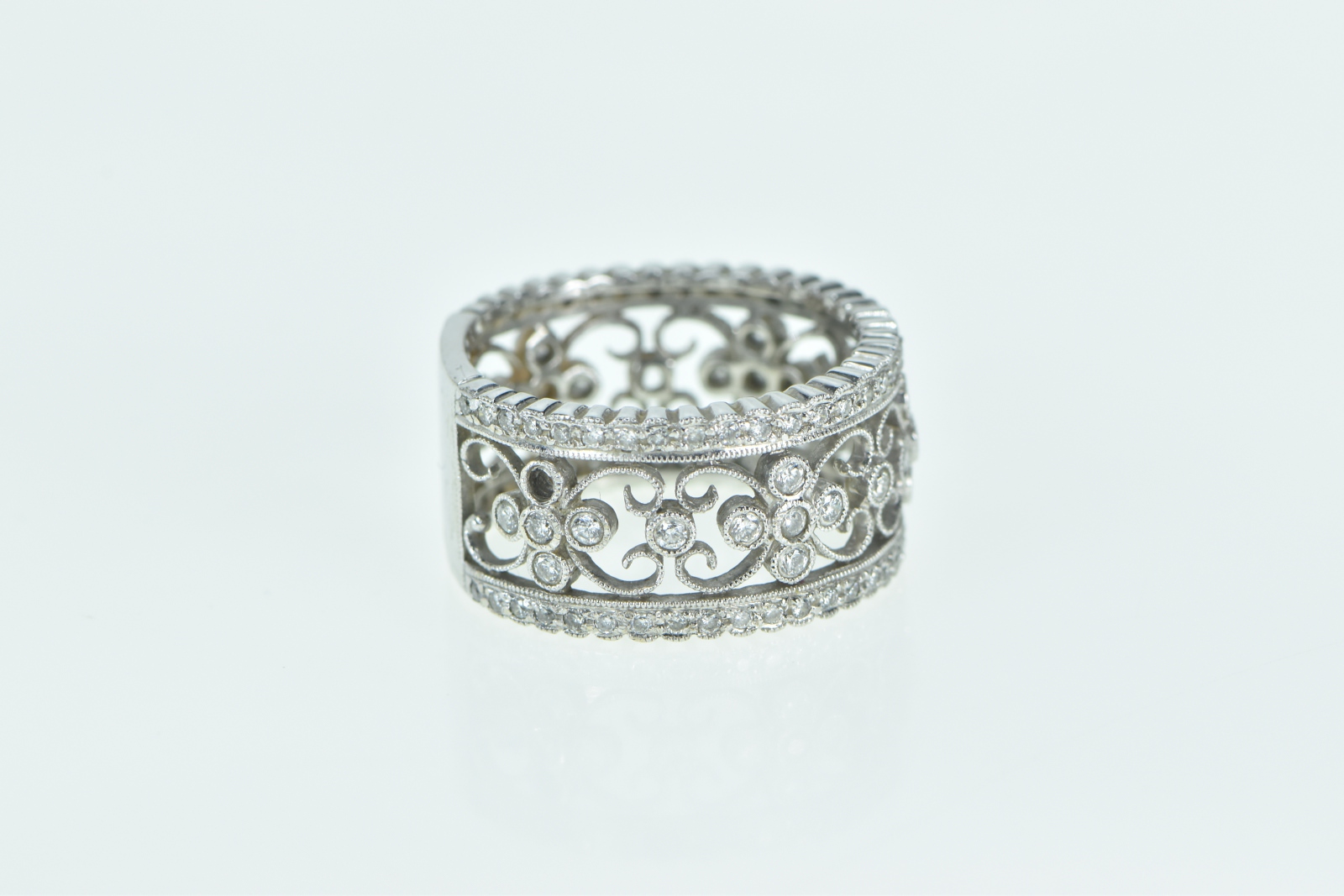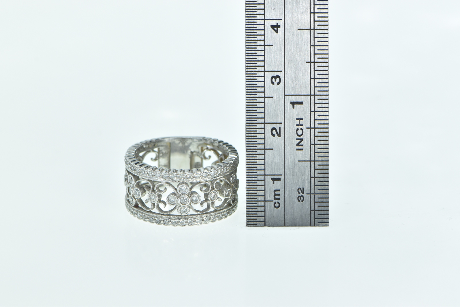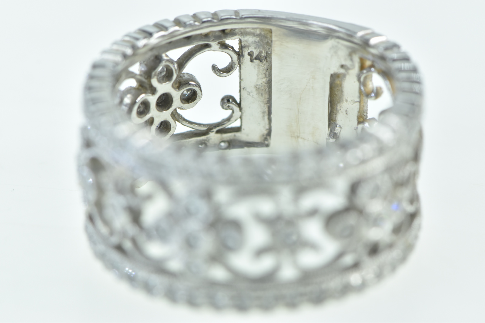 14K Ornate Diamond Scroll Filigree Statement Band White Gold Ring, Size 8