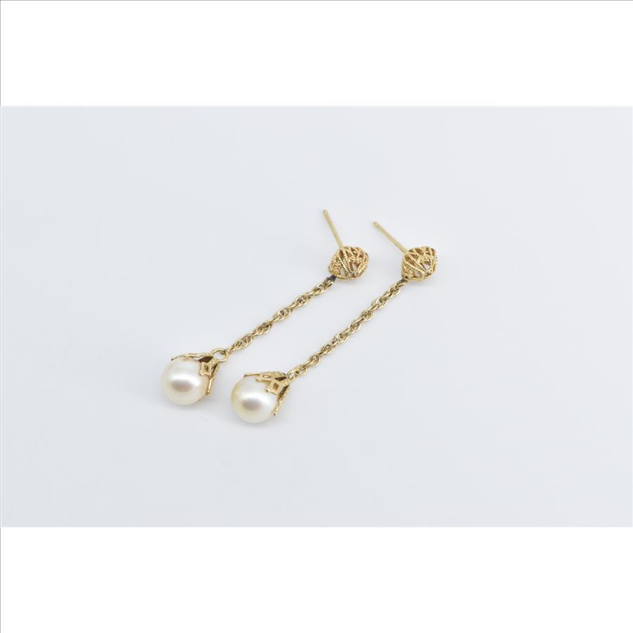 Item:  14K Ornate Filigree Pearl Fashion Dangle Yellow Gold Earrings