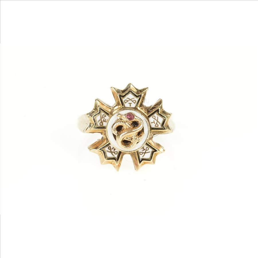 Item:  14K Ornate Sigma Nu Fraternity Snake Star Enamel Yellow Gold Ring, Size 4