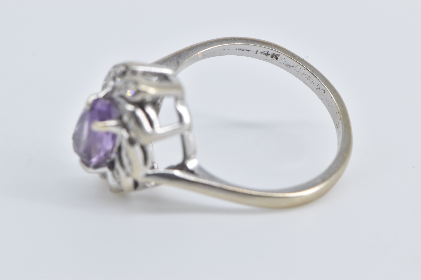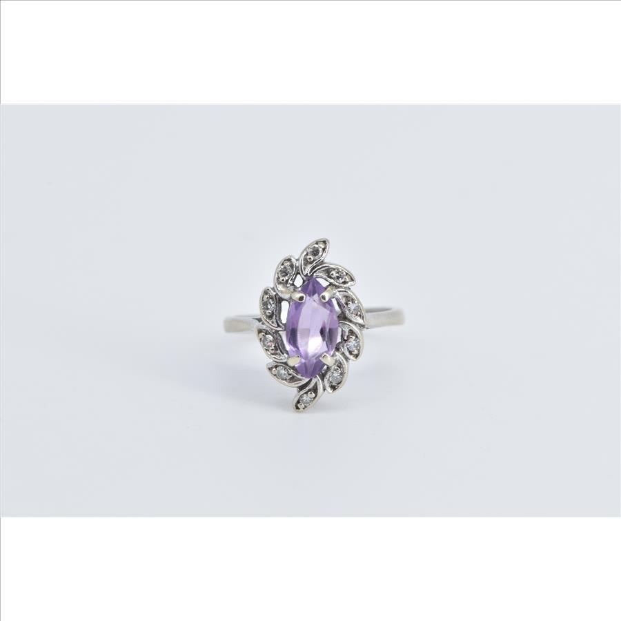 14K Oval Amethyst Diamond Halo Swirl Cluster White Gold Ring, Size 5.5