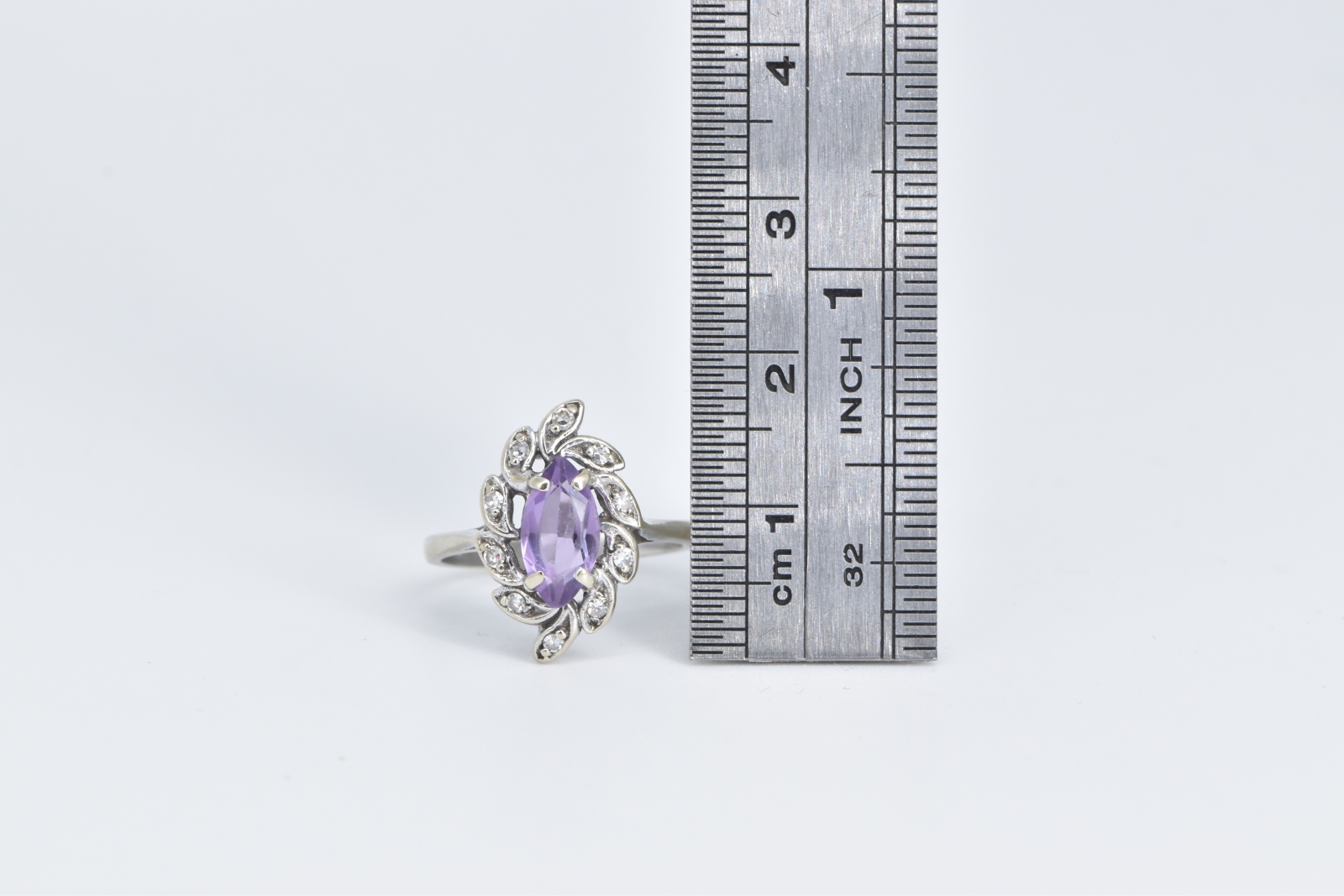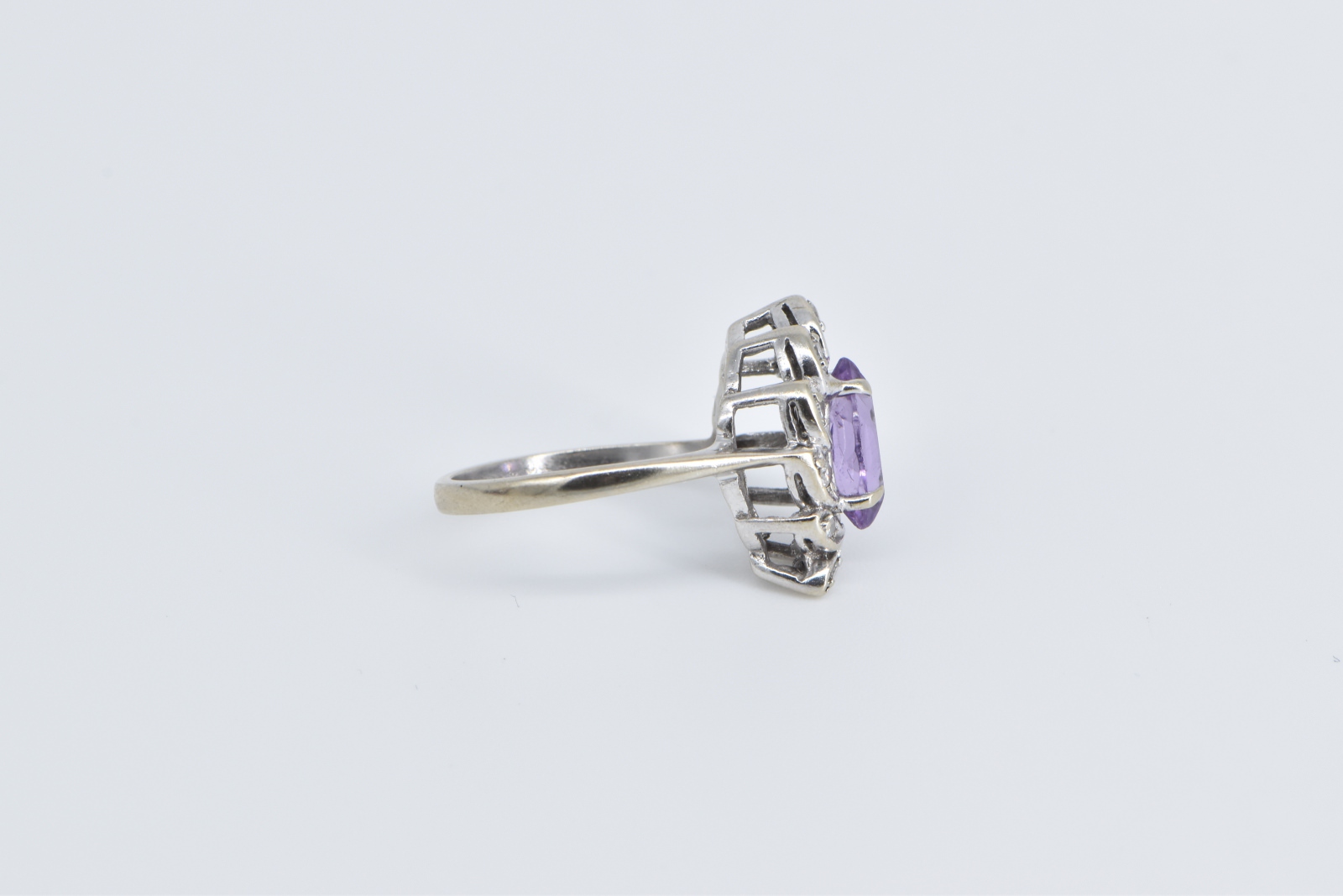 Item:  14K Oval Amethyst Diamond Halo Swirl Cluster White Gold Ring, Size 5.5