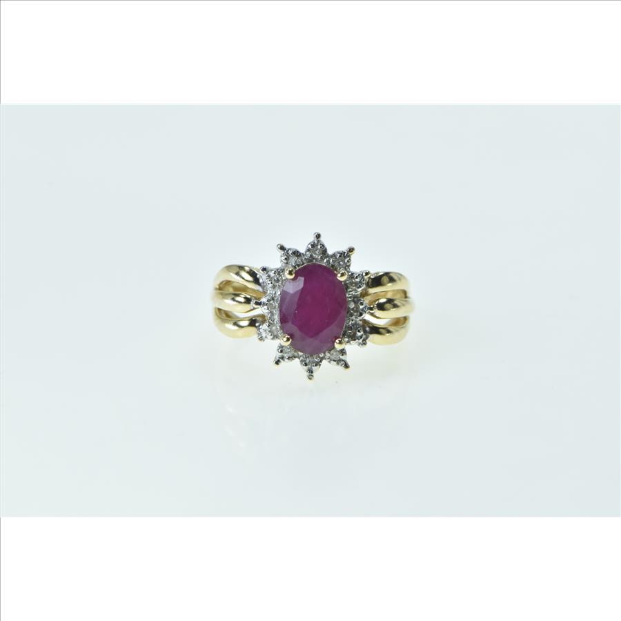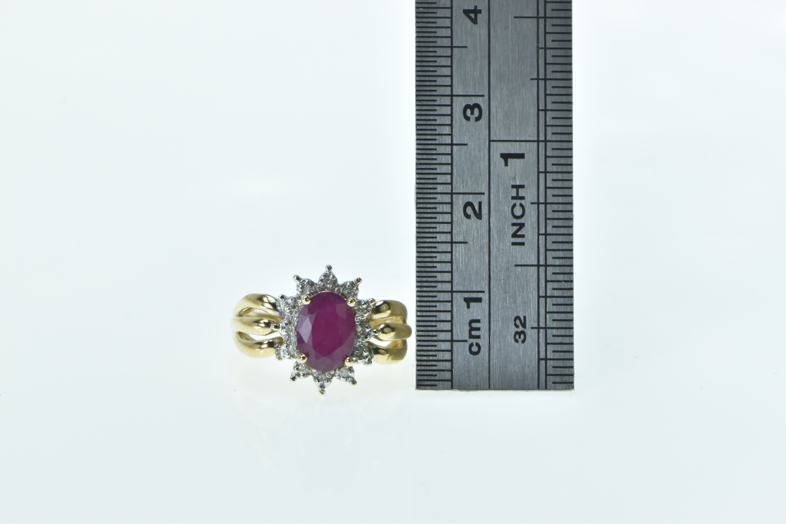 Item:  14K Oval Natural Ruby Diamond Halo Statement Yellow Gold Ring, Size 4.5