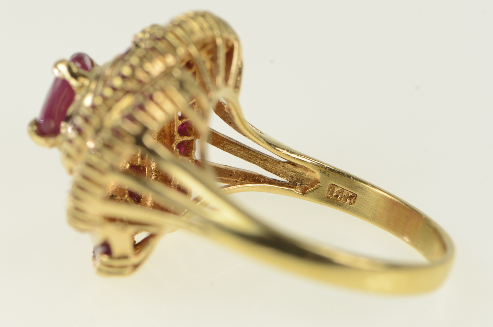 Item:  14K Oval Natural Ruby Swirl Halo Cocktail Yellow Gold Ring, Size 8.25