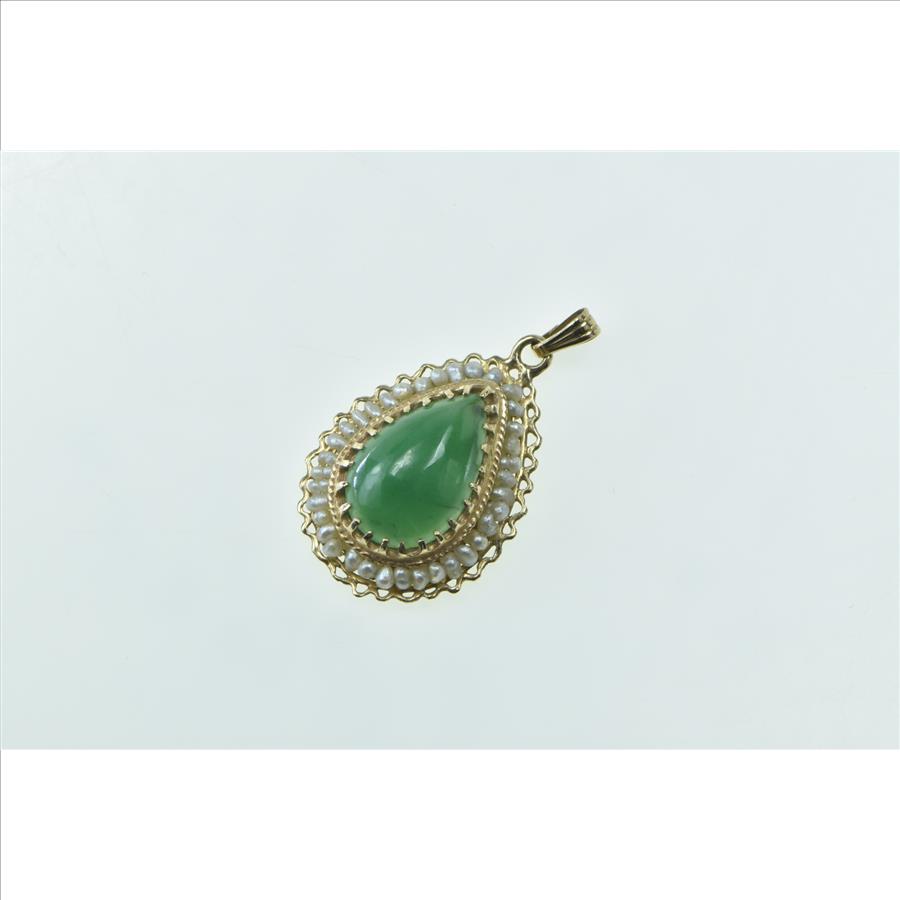 Item:  14K Pear Green Agate Seed Pearl Trim Statement Yellow Gold Pendant