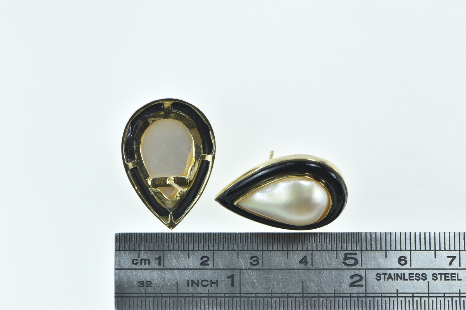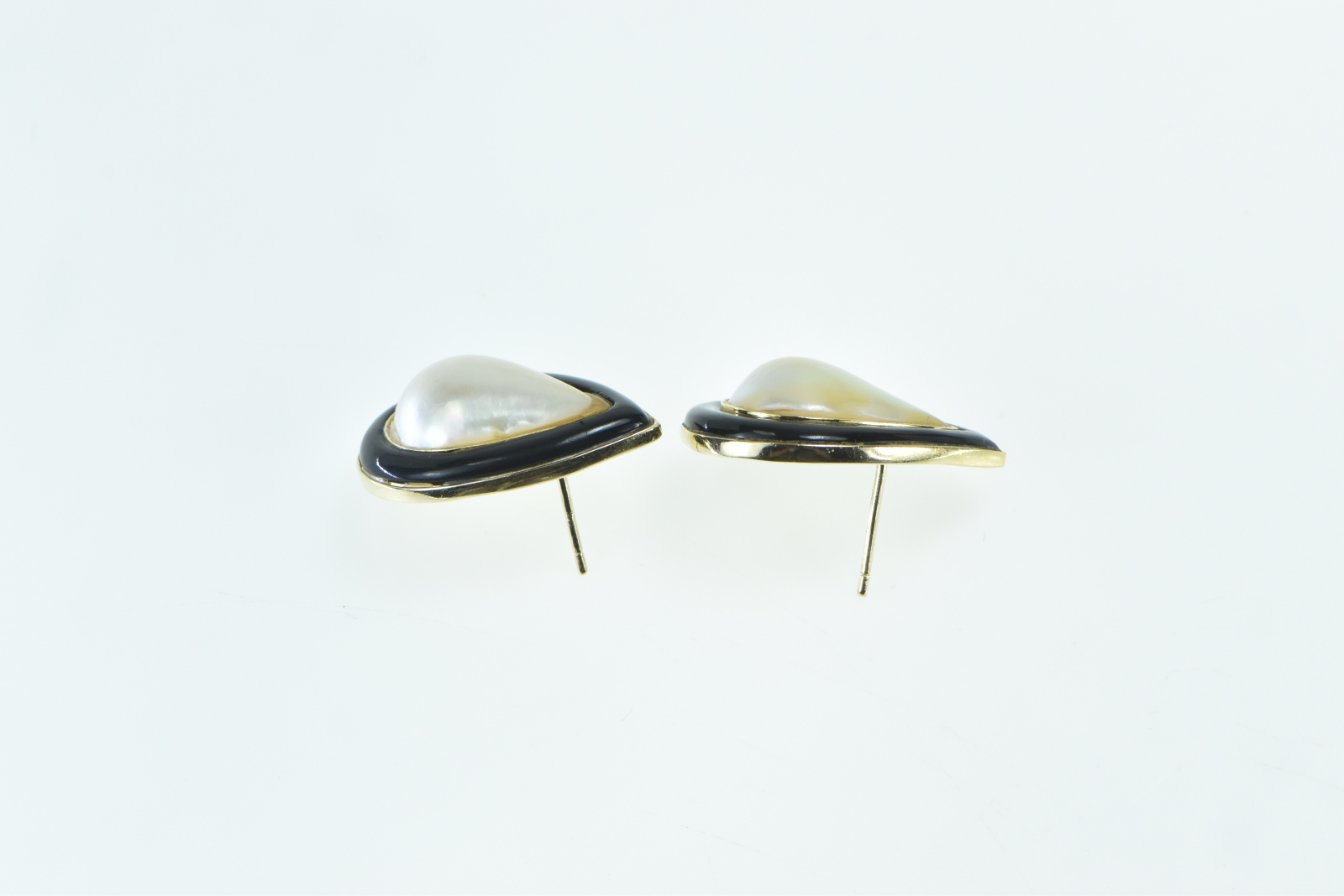 14K Pear Mother of Pearl Black Onyx Stud Yellow Gold Earrings