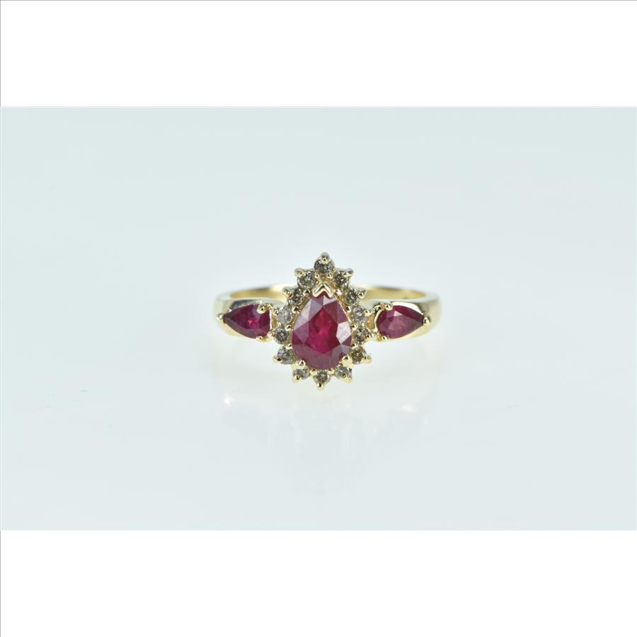Item:  14K Pear Ruby Diamond Halo Engagement Yellow Gold Ring, Size 7