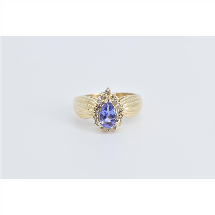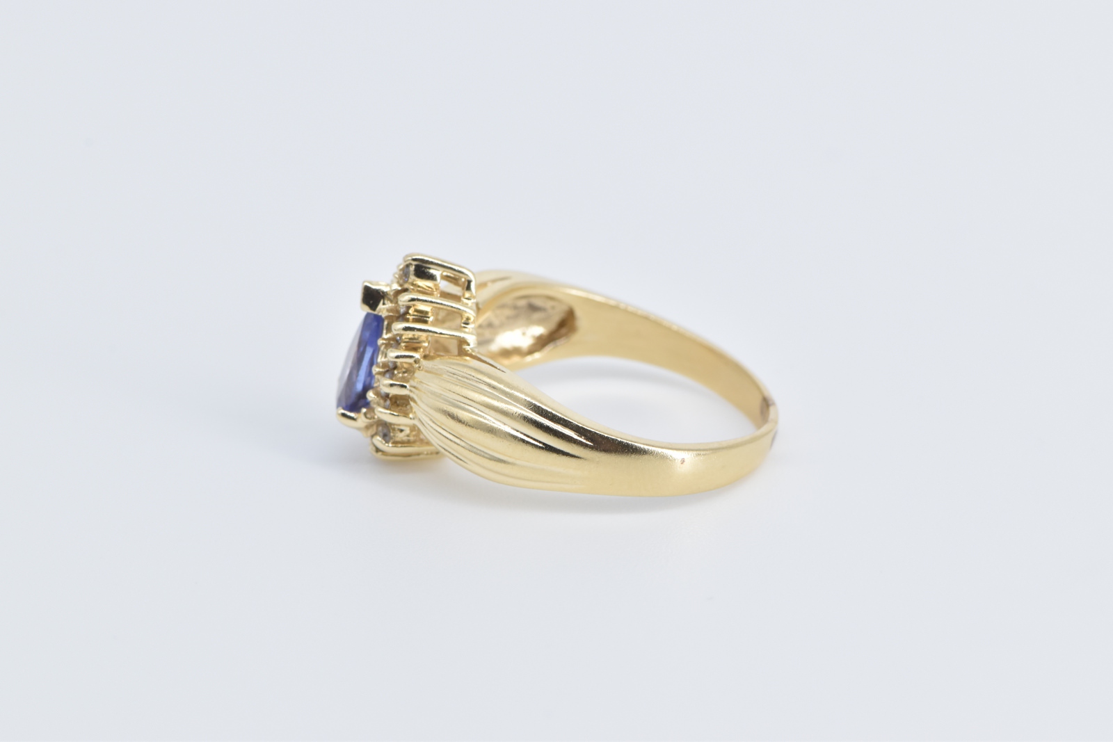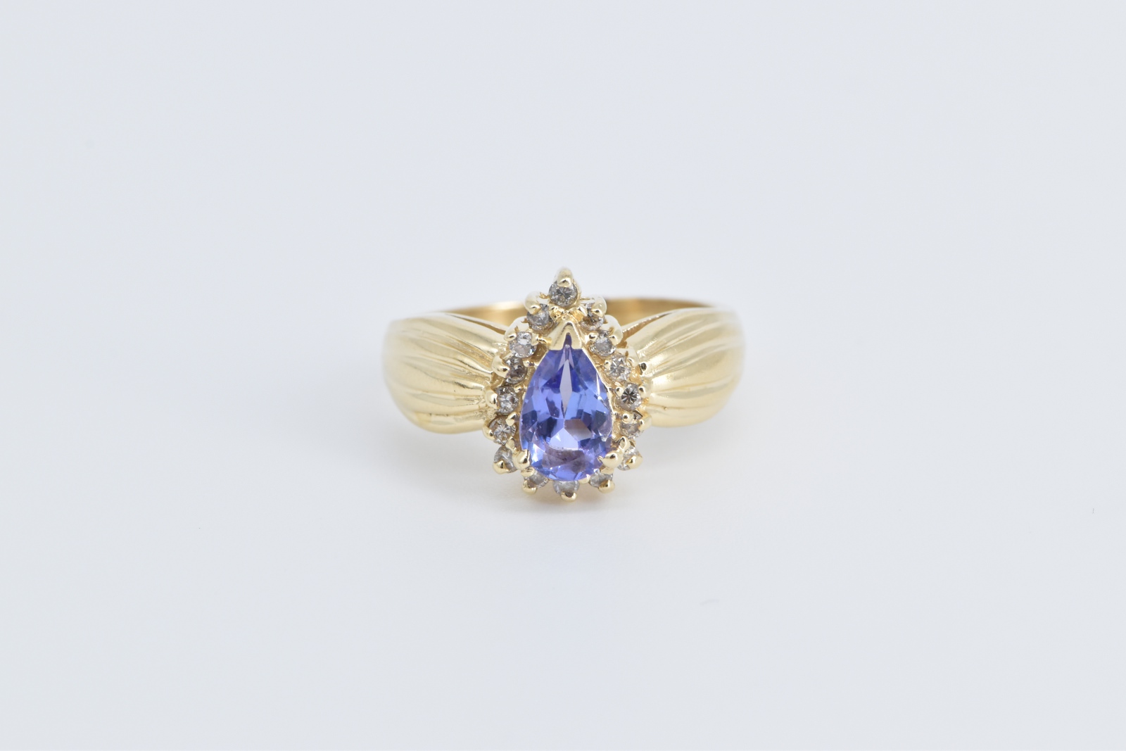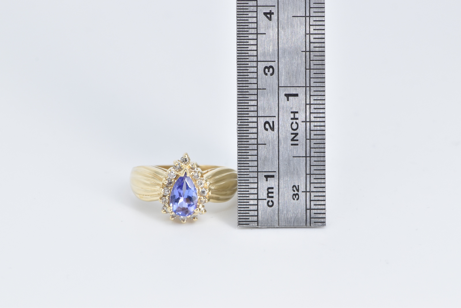 Item:  14K Pear Tanzanite Diamond Halo Statement Yellow Gold Ring, Size 7.25
