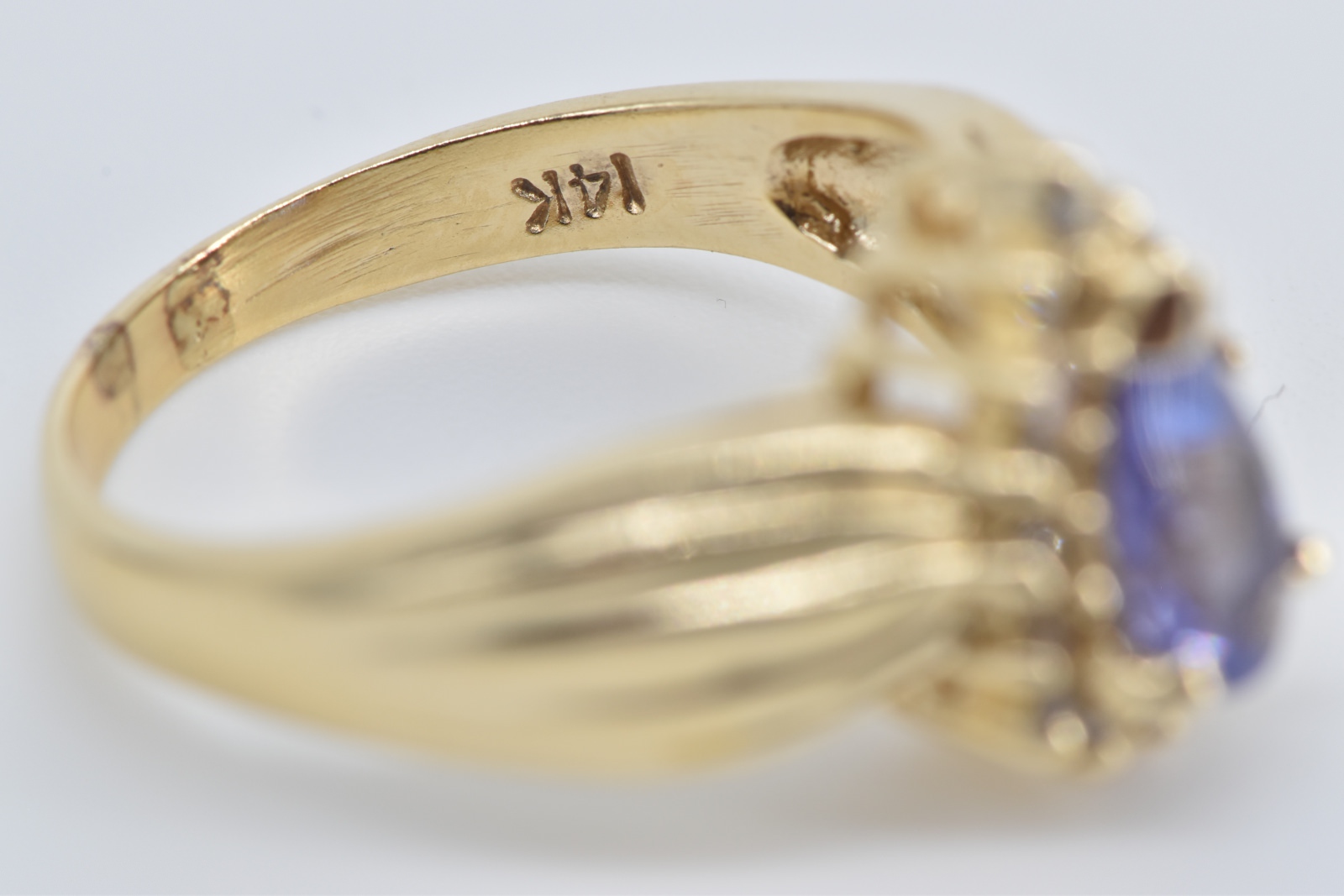14K Pear Tanzanite Diamond Halo Statement Yellow Gold Ring, Size 7.25