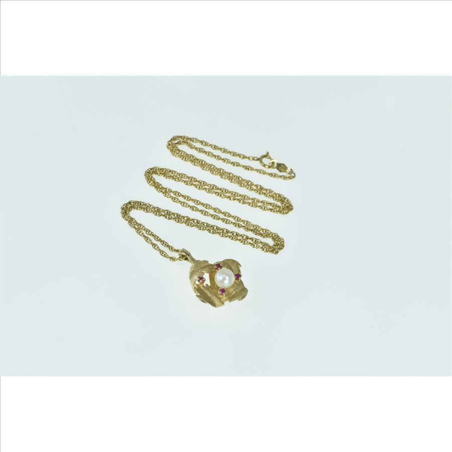 14K Pearl Ruby Ornate Leaf Vintage Rope Chain Yellow Gold Necklace 20"