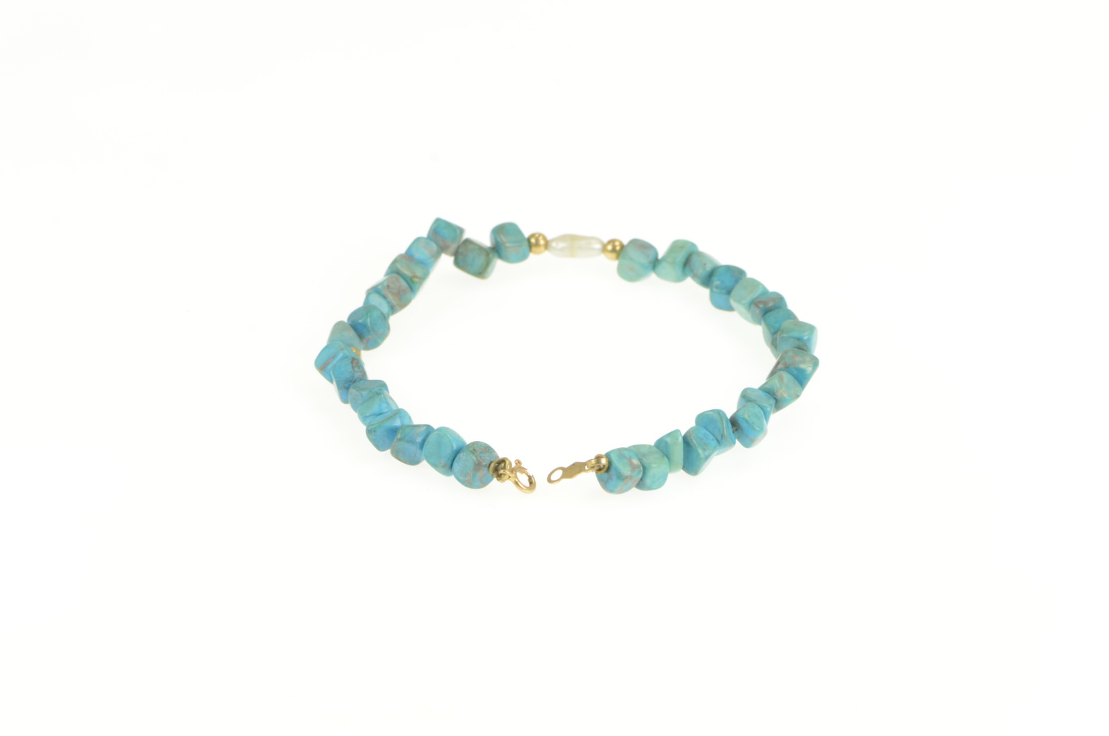 14K Pearl Square Turquoise Beaded Statement Yellow Gold Bracelet 6.5"